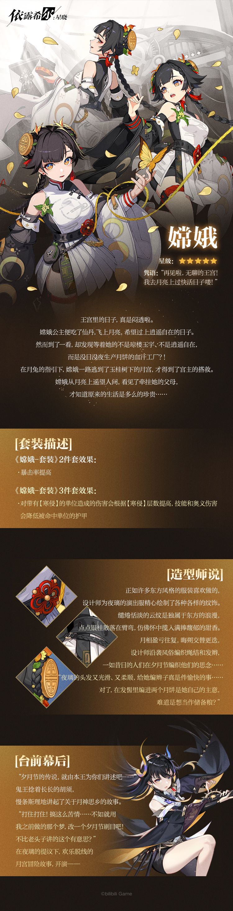 ✦夜璃 | 饰-嫦娥✦ 很久很久以前,有一个公主叫做嫦娥。她觉得王宫里的生活充满烦闷,便吃了仙丹,想要远远地离开家乡,飞到月亮上过无忧无虑的日子去。没想到,月亮上居然是一个做月饼的工厂,里面的金蟾大军见了她,便一路追赶,要把她抓进去当捣馅儿的工人…… 在月宫使者玉兔的指引下,嫦娥的惊险刺激大逃亡,就此开始! 〓剧作详情〓 五星剧作 | 嫦娥 〓套装效果〓 《嫦娥-套装》2件套效果:暴击率提高 《嫦