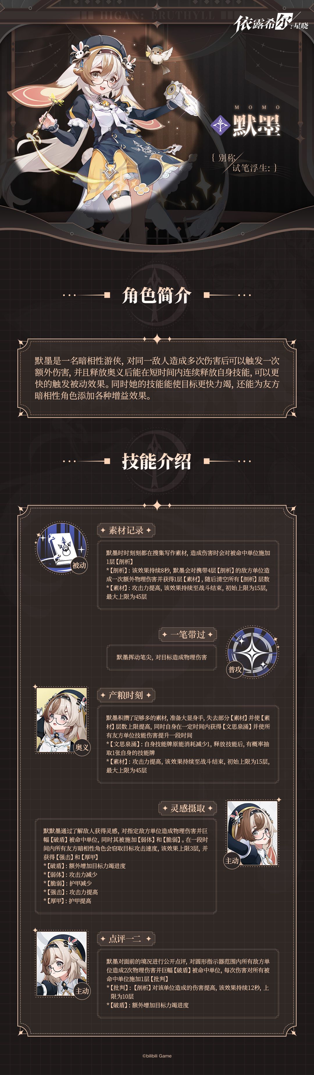 ✦默墨 | 试笔浮生✦ 品质:SR 职业:暗系游侠 所属小队:十三门徒 技能简介:默墨是一名暗相性游侠,对同一敌人造成多次伤害后可以触发一次额外伤害,并且释放奥义后能在短时间内连续释放自身技能,可以更快的触发被动效果。同时她的技能能使目标更快力竭,还能为友方暗相性角色添加各种增益效果。 ——「呜……请不要捏我的耳朵。」 ※卡司「默墨」将于近期首次登场。更多情报请持续关注~