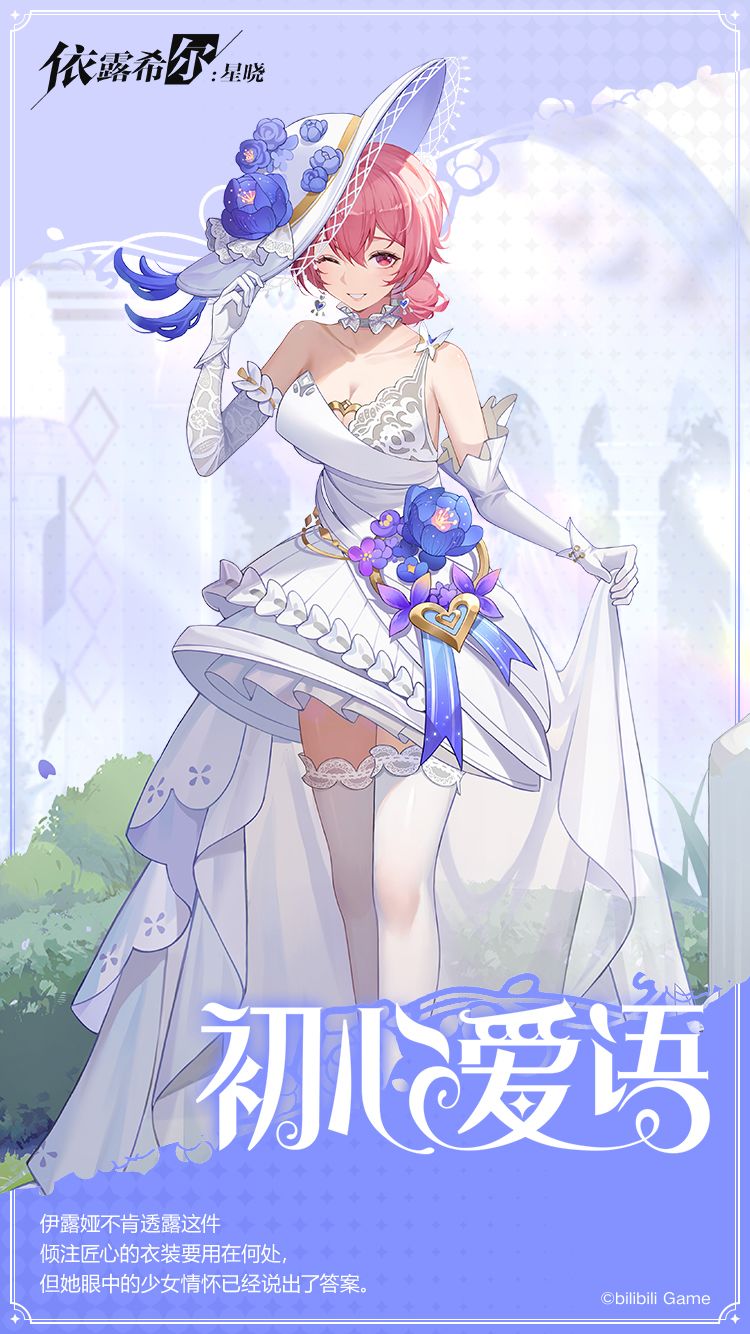 ✦ 伊露娅 | 初心爱语 ✦ 全新衣装披露。属于伊露娅的浪漫呢喃。 皎白裙摆和矜贵的靛蓝配饰。漫天花雨吞吞吐吐谁的小心思。 ——「伊露娅不肯透露这件倾注匠心的衣装要用在何处,但她眼中的少女情怀已经说出了答案。」