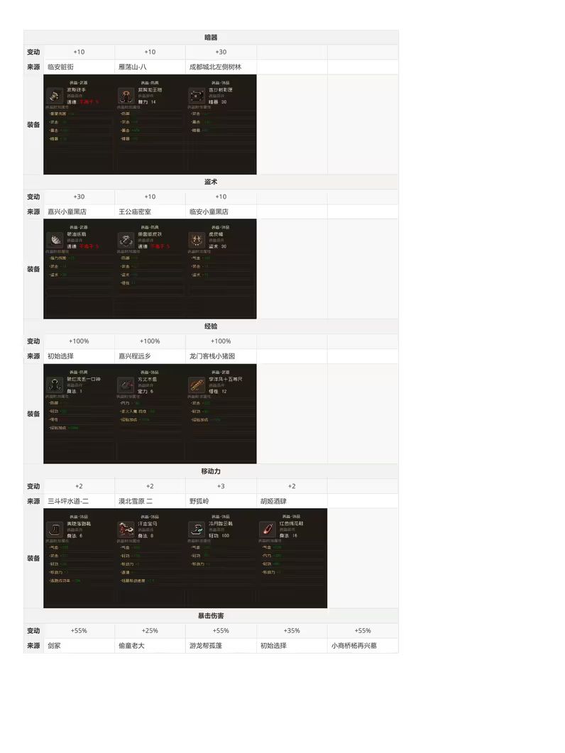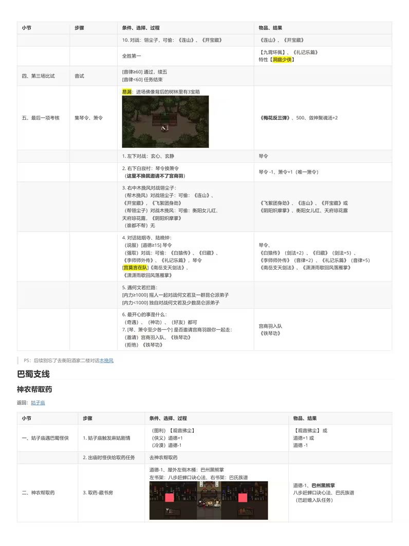 转载B站老哥 透明城墙 【攻略正文(共分为注意事项/路线分歧)】 [一些阅读本文的注意事项,重要] 1.文中加【】代表该内容为可装备物品,《》代表该内容为武学秘籍。 2.部分消耗道具可能会在触发某些剧情时需要,因此建议至少都留一个。 3.大地图上的花朵或者小石块顺手调查下,有奖励,基本上是少量铜钱或恢复药,就不详细写了。类似的,部分BOSS敌人身上有可盗取的铜钱或一般消耗品,我也不会详细写