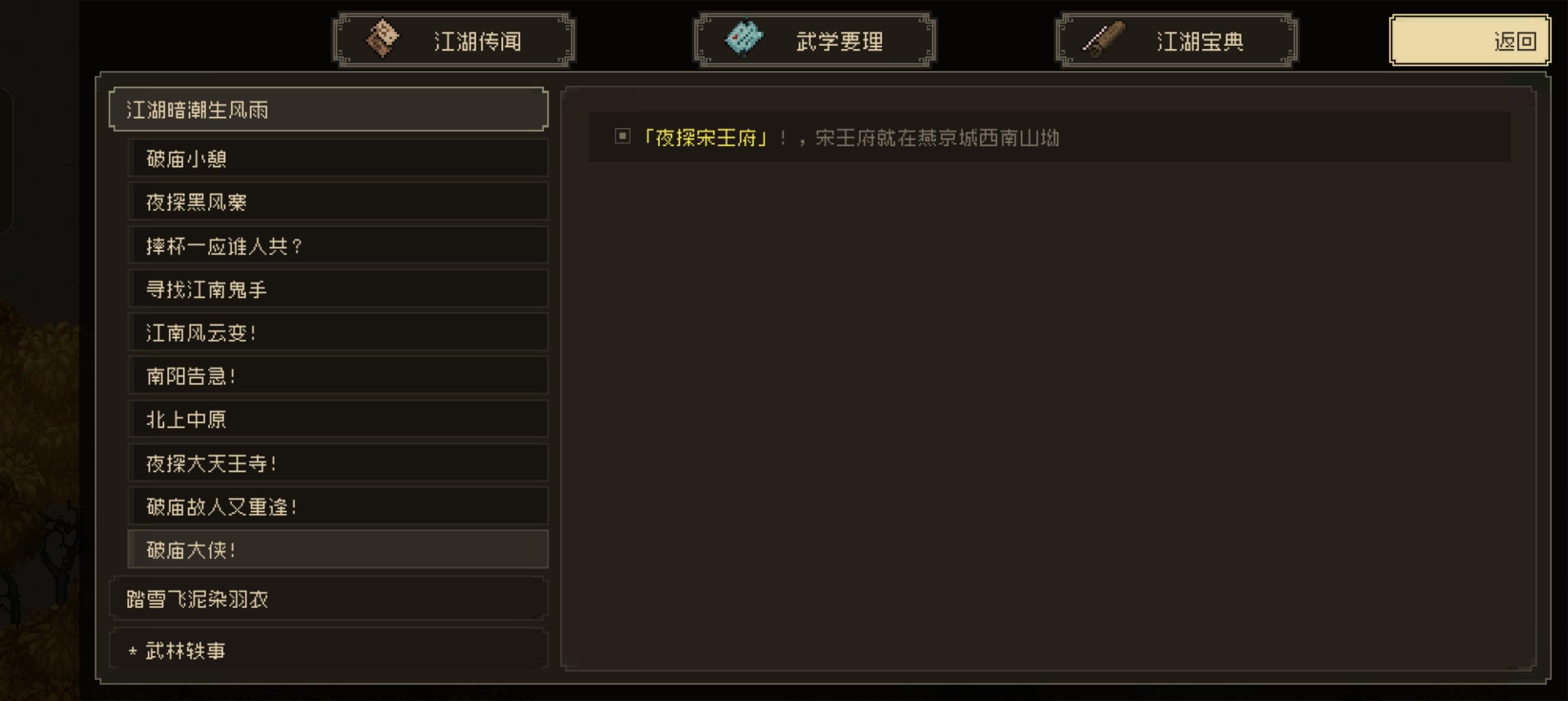 转载B站老哥 透明城墙 【攻略正文(共分为注意事项/路线分歧)】[一些阅读本文的注意事项,重要] 1.文中加【】代表该内容为可装备物品,《》代表该内容为武学秘籍。 2.部分消耗道具可能会在触发某些剧情时需要,因此建议至少都留一个。 3.大地图上的花朵或者小石块顺手调查下,有奖励,基本上是少量铜钱或恢复药,就不详细写了。类似的,部分BOSS敌人身上有可盗取的铜钱或一般消耗品,我也不会详细写