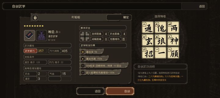 第四周目快结束了,第一次自创技能,整了个大的释放一次技能,召唤的羊咩咩,可以覆盖周围一圈了。等我下周目试试,靠羊咩咩成为江湖第一人。技能范围越大,召唤的数量越多,按照这个逻辑,就选4*4技能范围的模板。核心特性就是六号位-招蜂引蝶,可以召唤羊咩咩,其他位置可以自选自己喜欢的特性。#游戏日常