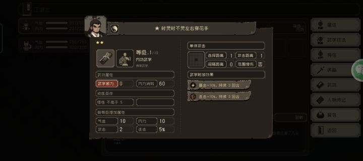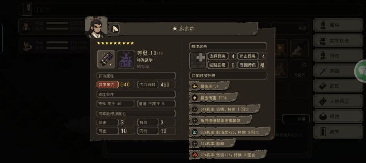 三周目慕容女号结束,现在开个四周目少室山孤儿。前三周目都是炼狱模式,游戏算是玩上手了。从三周目继承了突破的玄玄功、突破的左右、突破的厨神、白板斗转参横。这玄玄是在第三周目突破的,灼烧、醉酒、眩晕三个状态,准备见谁灭谁,吼吼!!