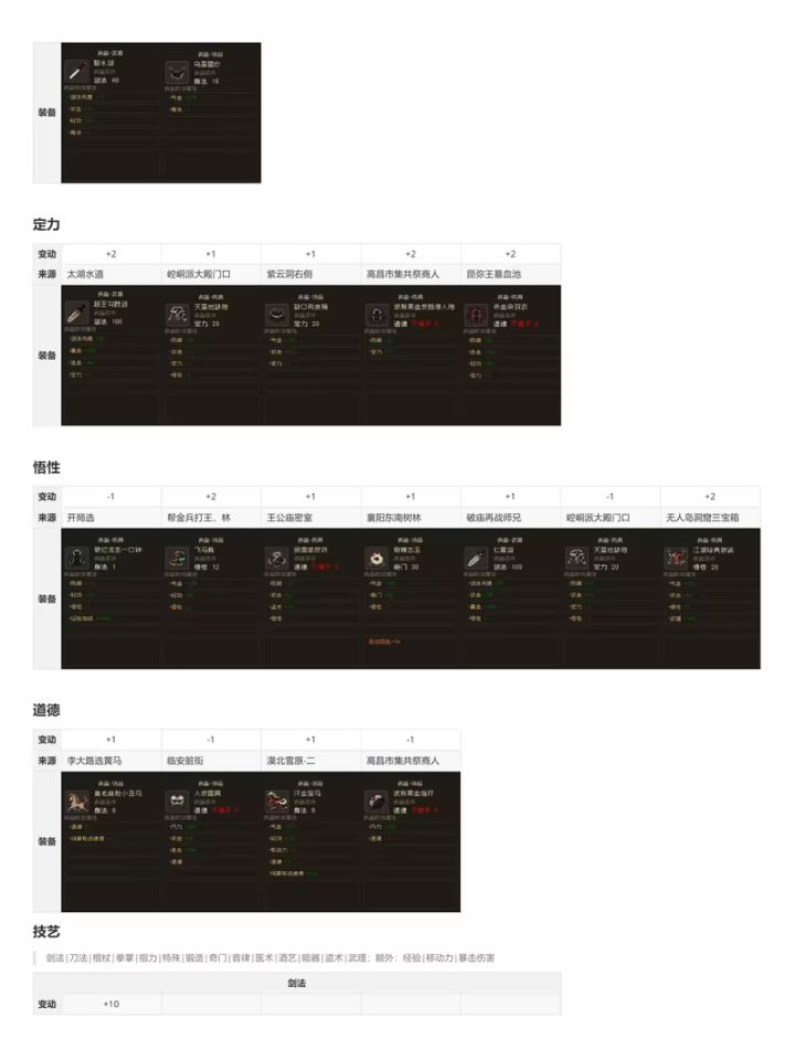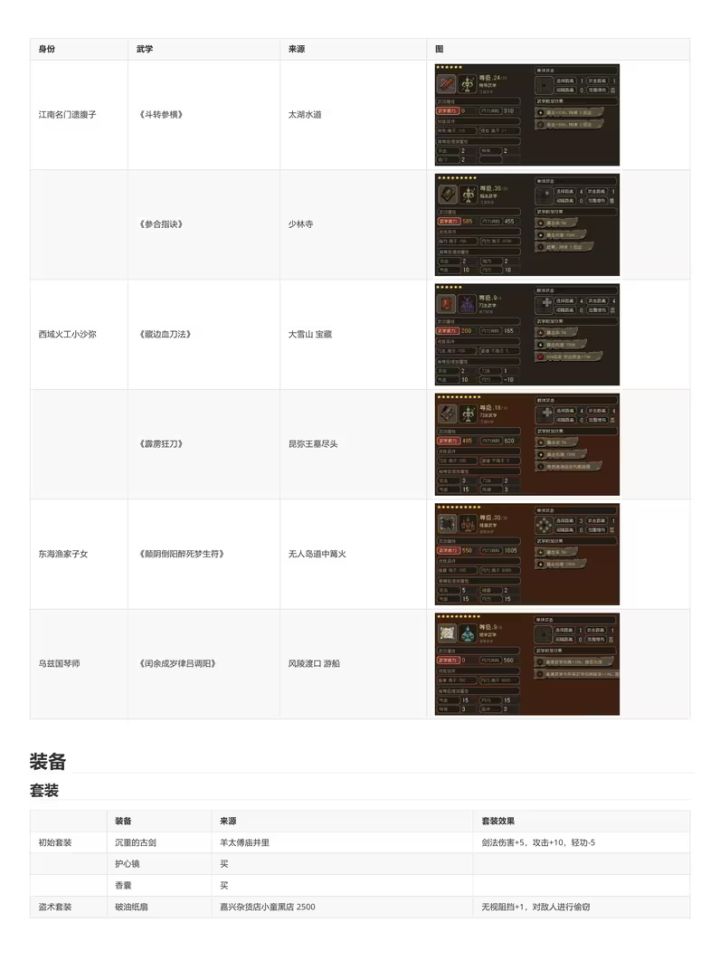 转载B站老哥 透明城墙 【攻略正文(共分为注意事项/路线分歧)】[一些阅读本文的注意事项,重要] 1.文中加【】代表该内容为可装备物品,《》代表该内容为武学秘籍。 2.部分消耗道具可能会在触发某些剧情时需要,因此建议至少都留一个。 3.大地图上的花朵或者小石块顺手调查下,有奖励,基本上是少量铜钱或恢复药,就不详细写了。类似的,部分BOSS敌人身上有可盗取的铜钱或一般消耗品,我也不会详细写
