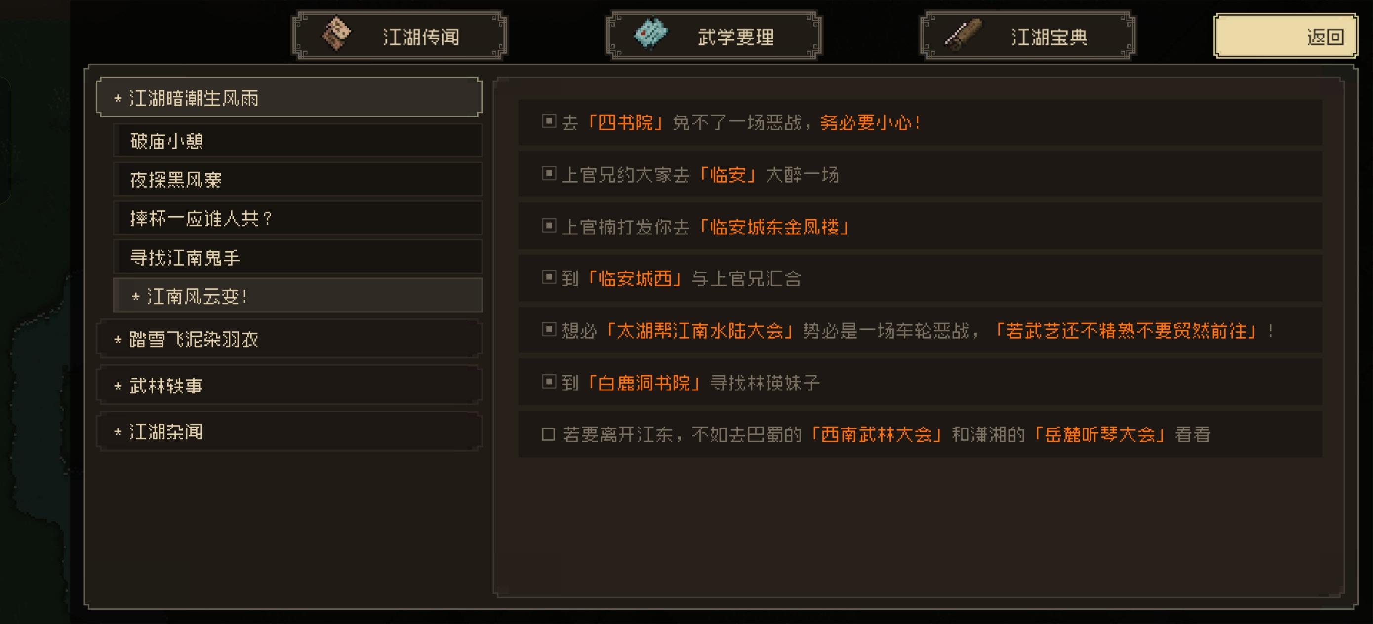 转载B站老哥 透明城墙 【攻略正文(共分为注意事项/路线分歧)】[一些阅读本文的注意事项,重要] 1.文中加【】代表该内容为可装备物品,《》代表该内容为武学秘籍。 2.部分消耗道具可能会在触发某些剧情时需要,因此建议至少都留一个。 3.大地图上的花朵或者小石块顺手调查下,有奖励,基本上是少量铜钱或恢复药,就不详细写了。类似的,部分BOSS敌人身上有可盗取的铜钱或一般消耗品,我也不会详细写