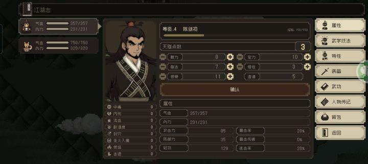 三周目慕容女号结束,现在开个四周目少室山孤儿。前三周目都是炼狱模式,游戏算是玩上手了。从三周目继承了突破的玄玄功、突破的左右、突破的厨神、白板斗转参横。这玄玄是在第三周目突破的,灼烧、醉酒、眩晕三个状态,准备见谁灭谁,吼吼!!