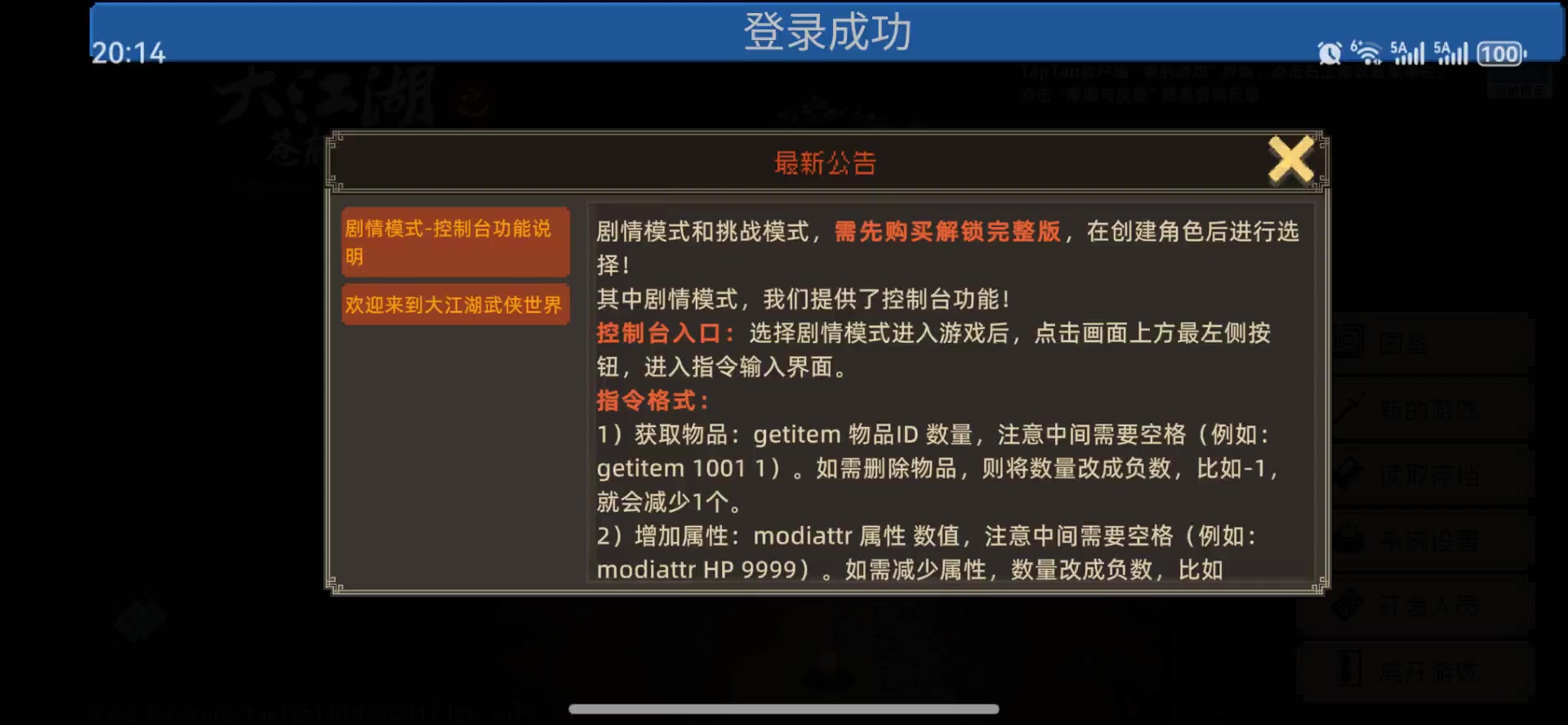 新版本更新了,汇总一下指令,不然查来查去很麻烦指令格式:1)获取物品:getitem 物品ID 数量,注意中间需要空格(例如:getitem 1001 1)。如需删除物品,则将数量改成负数,比如-1,就会减少1个。2)增加属性:modiattr 属性 数值,注意中间需要空格(例如:modiattr HP 9999)。如需减少属性,数量改成负数,比如modiattr ATK -100,则减少1