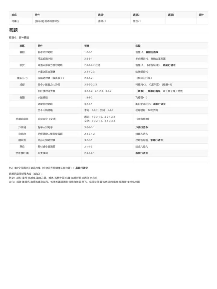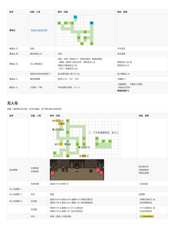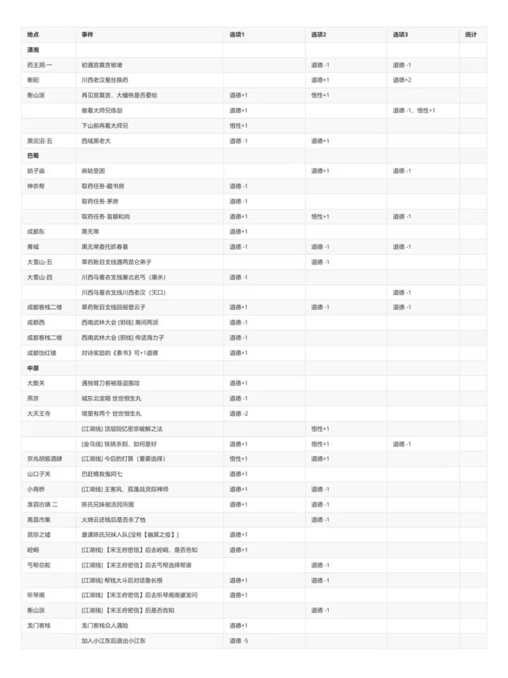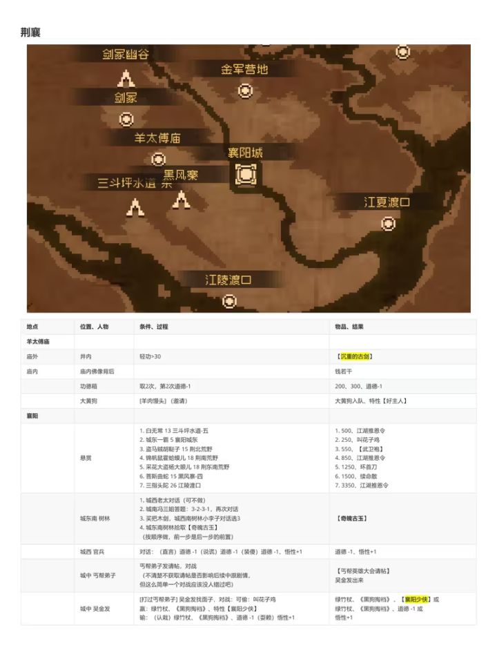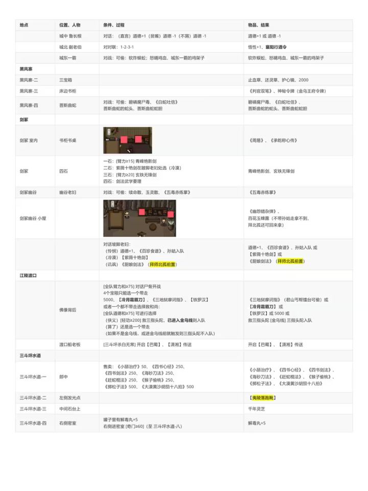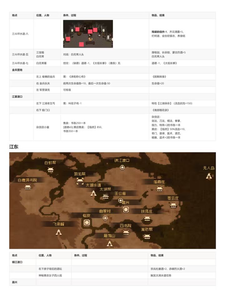转载B站老哥 透明城墙 【攻略正文(共分为注意事项/路线分歧)】[一些阅读本文的注意事项,重要] 1.文中加【】代表该内容为可装备物品,《》代表该内容为武学秘籍。 2.部分消耗道具可能会在触发某些剧情时需要,因此建议至少都留一个。 3.大地图上的花朵或者小石块顺手调查下,有奖励,基本上是少量铜钱或恢复药,就不详细写了。类似的,部分BOSS敌人身上有可盗取的铜钱或一般消耗品,我也不会详细写