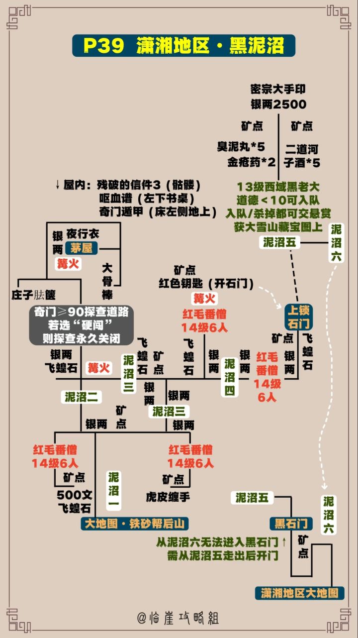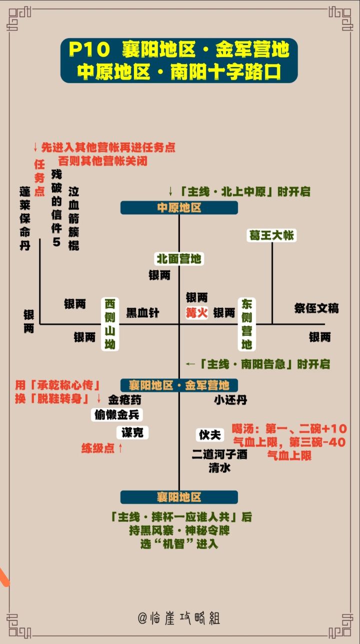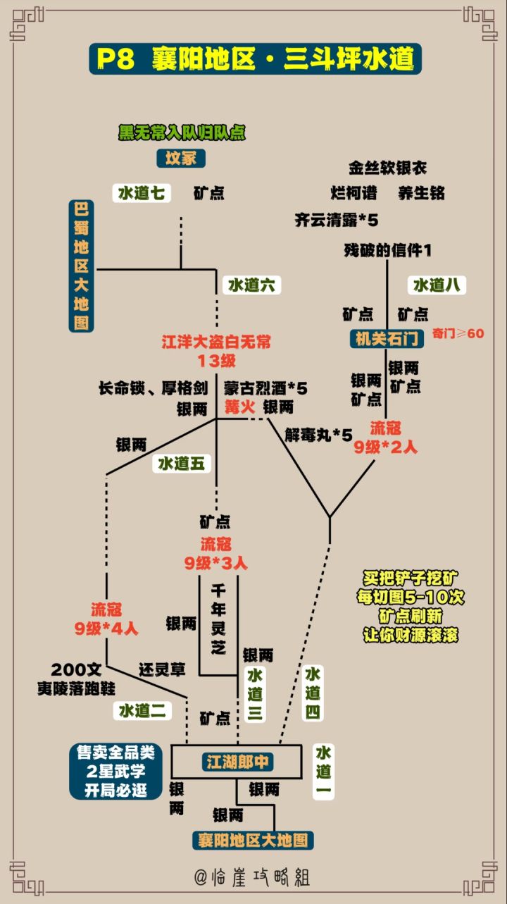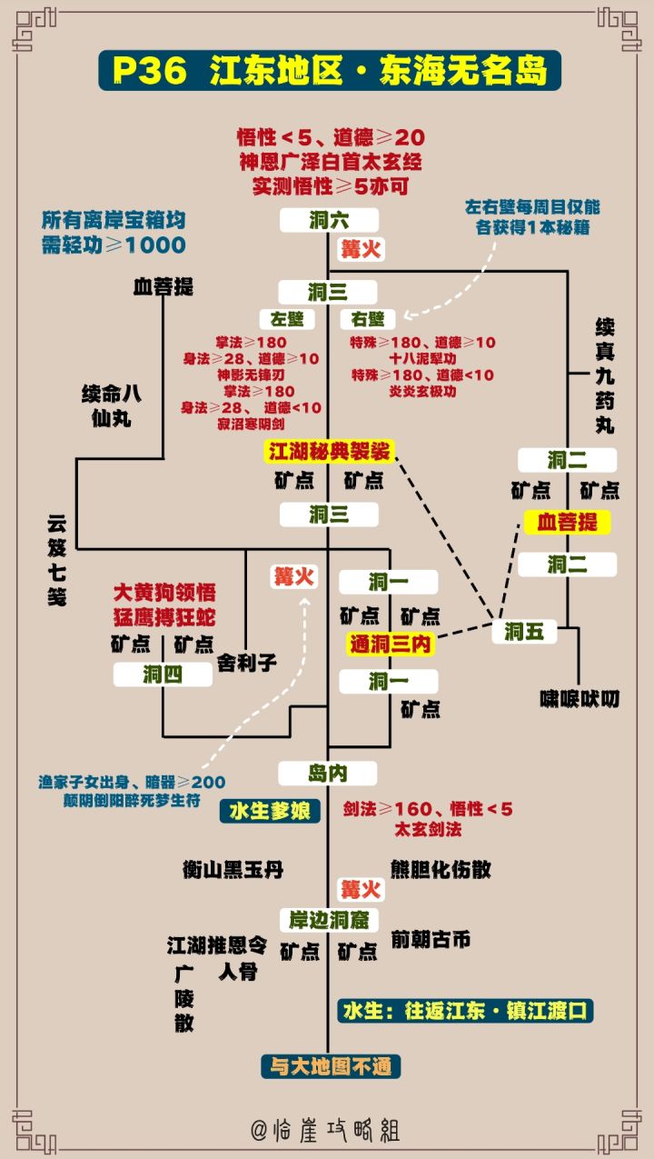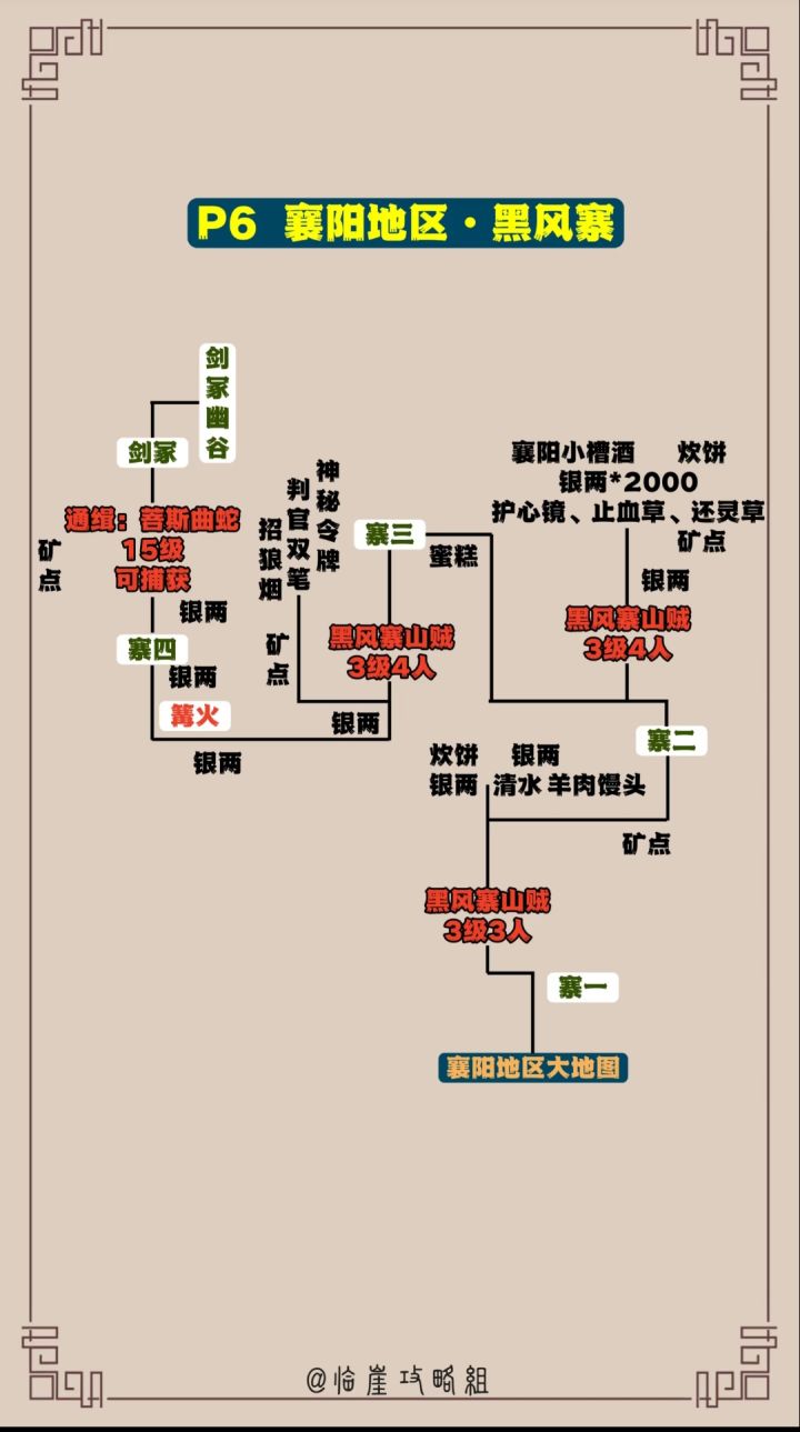 转载B站老哥 透明城墙 【攻略正文(共分为注意事项/路线分歧)】[一些阅读本文的注意事项,重要] 1.文中加【】代表该内容为可装备物品,《》代表该内容为武学秘籍。 2.部分消耗道具可能会在触发某些剧情时需要,因此建议至少都留一个。 3.大地图上的花朵或者小石块顺手调查下,有奖励,基本上是少量铜钱或恢复药,就不详细写了。类似的,部分BOSS敌人身上有可盗取的铜钱或一般消耗品,我也不会详细写