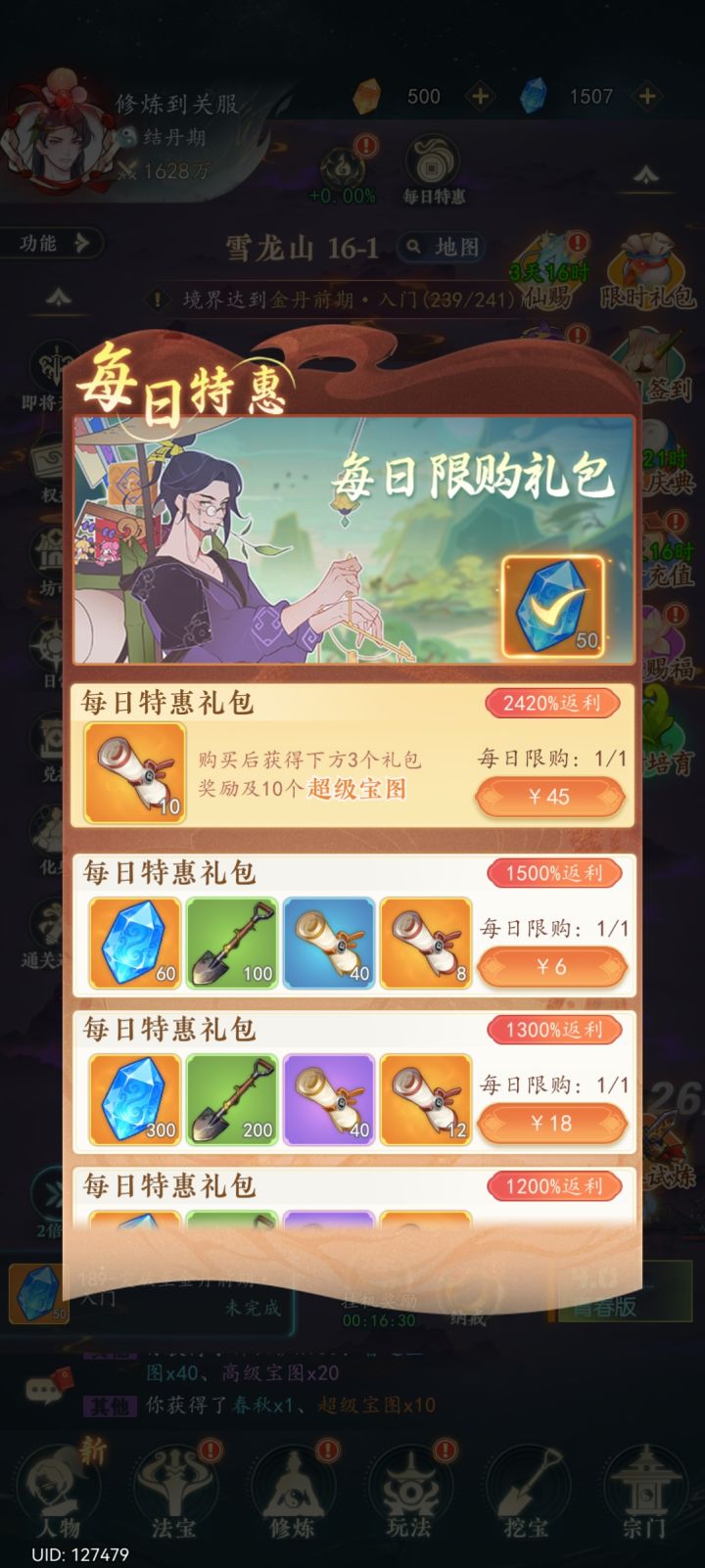 首先就是最基础的,本游戏的法宝分为三大派系,飞剑,绝技,道法。总结一下就是飞剑:简单易上手,爆发伤害高,适合什么都不懂的新玩家,简单且纯粹。绝技:上手难度高,各类技能齐全,适合喜欢研究游戏的玩家,理论上限最高。道法:真路边一条,伤害刮痧的一批,适合喜欢没苦硬吃的玩家,只有太极图好用。先说新手们最想知道的搭配问题吧。首先是法宝整体搭配,我推荐4+2,是目前最合适最实用的搭配。然后平民玩家的