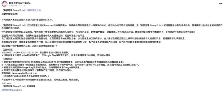 原博主已经把微博给删了,具体最好还是以官方消息为准,大家理性吃瓜。另外,游戏在这之前确实是有被砍的迹象,在前两天的时候,游戏的台服运营宣布了要退款。以下消息来自:游戏新知-夜风最近,B站旗下的一款在研女性向手游《代号C》被爆出项目已砍的消息。有知情人士告诉游戏新知,这款游戏在10月中旬就已经被砍了。在B站、TapTap、微博等官方消息渠道上,游戏的最新一条消息停止在了10月12日。 去年的8