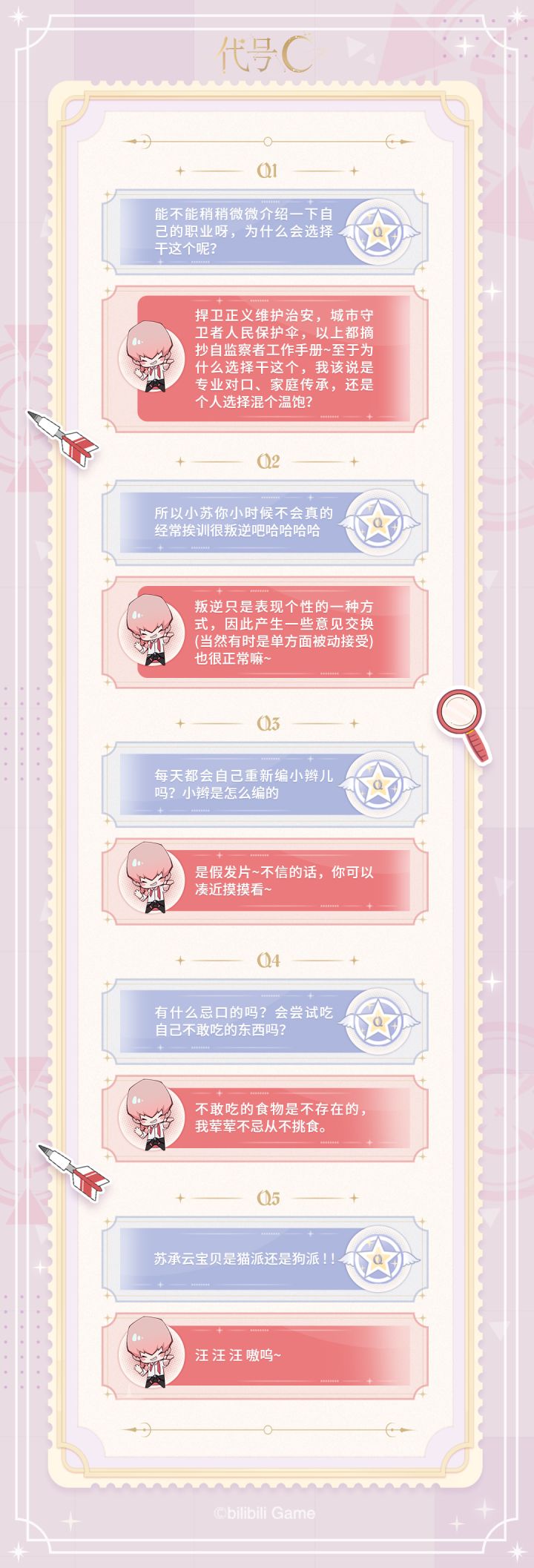 “每一条回答都彰显着他不羁的性格,似乎通过文字都能看到他张扬灿烂的笑容,仿佛他的声音就在耳边,一点点地拨开你对他所有的好奇。”虚拟小助手已为修复师整理好苏承云的回答,您可以点开大图查看哦~——NE.2050 来自OSO系统提示【♥】更多消息请修复师们注意关注以下官方平台!【代号C】官方微博:@代号C手游【代号C】官方B站:@代号C手游【代号C】官方Q群:官方1群: 238288026