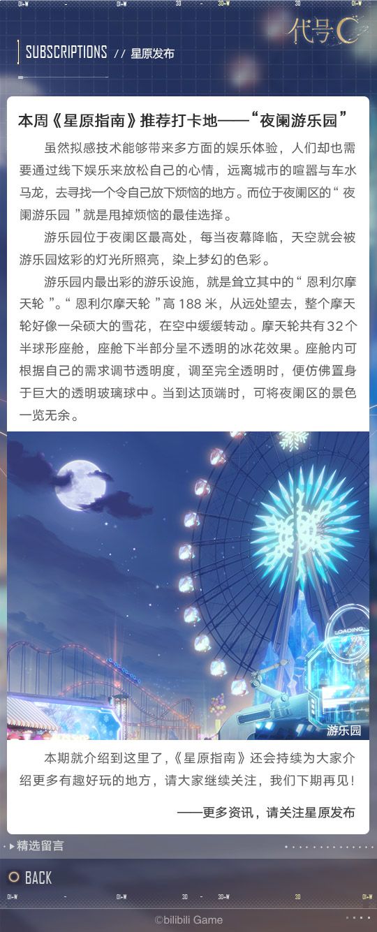 科技飞速发展的今天,您是否也需要一个远离城市喧嚣,告别车水马龙,能让自己放下烦恼的地方呢?那位于夜阑区的"夜阑游乐园"便是您最佳的选择。更多情报点击查看>> ————————【♥】加入官方群,获取一手官方资讯!【代号C】官方1群 238288026【代号C】官方2群 856149313