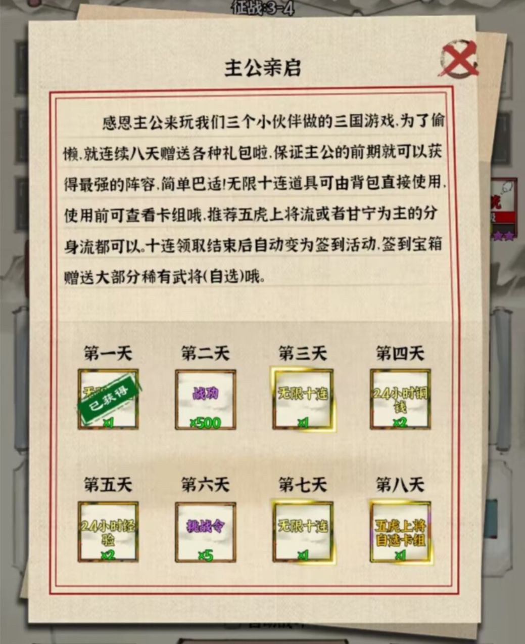 初始8天活动 3个十连无限,选的武将根据你自己的喜欢的国家选,主推肉,前期单将很好用,中后期有稀有将了也可以更换. 稀有将: 吕布 华佗 貂蝉 太史慈 周瑜 诸葛亮 赵云 关羽 司马懿 曹操。这些将除了吕布只能再抽卡的宝箱里面出,现在还有个保底宝箱,其他9位可以再每日6块刷新,每天随机,以及分解宝箱那边有三个稀有,无限十连没有稀有将,自行对比选取。 战令 会员 宴请卷的主要出处,最高是200级,到