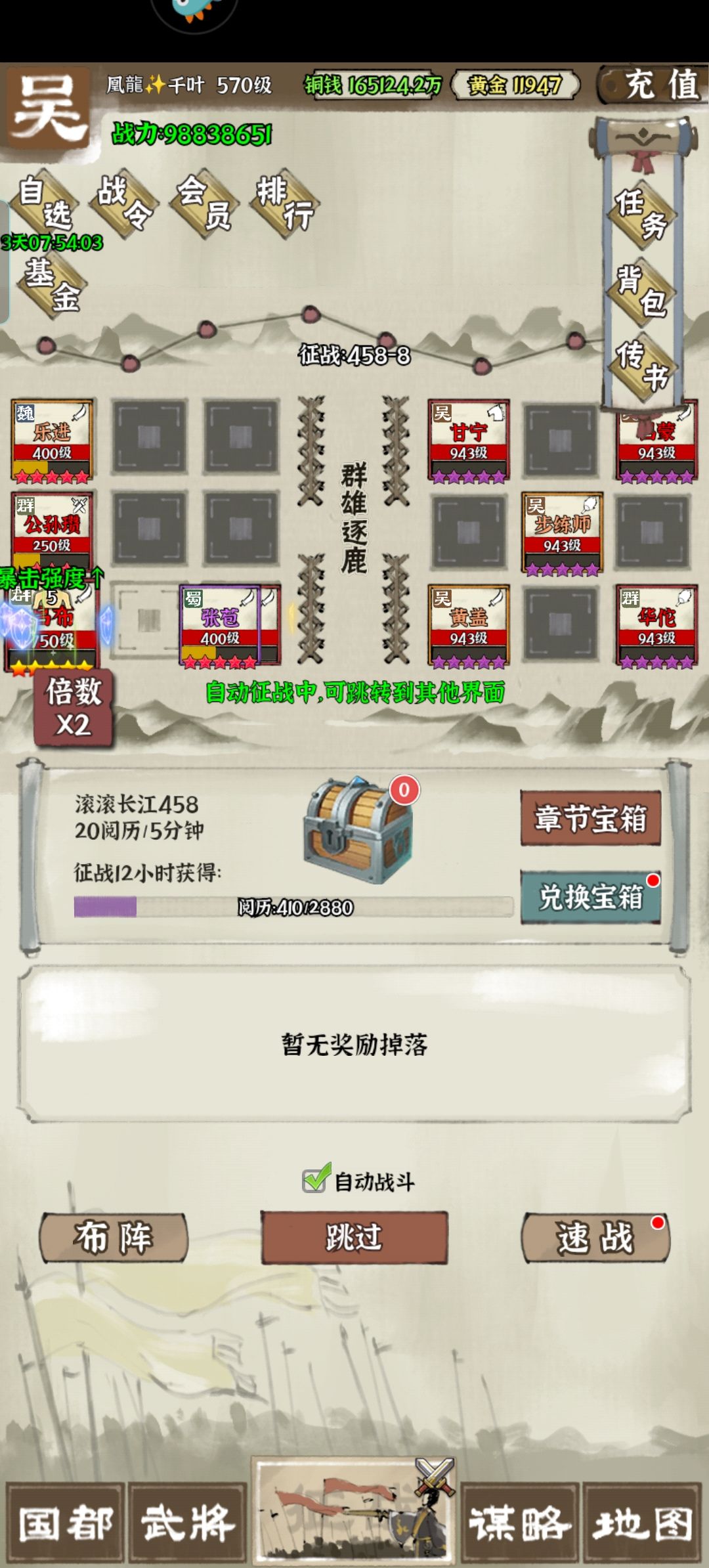 阵容:吕布、张苞、黄忠、公孙赞、乐进 神器:公孙及乐进分别带个七杀,吕布无双,其它全部墨攻 神兽:(玄鸟)吕布、(大鹏)张苞、(凤凰)黄忠、(龙马)公孙赞、(陆吾)乐进 阵形:自由L,7,⊥ 该配置,直推458一8关,中途不用换将