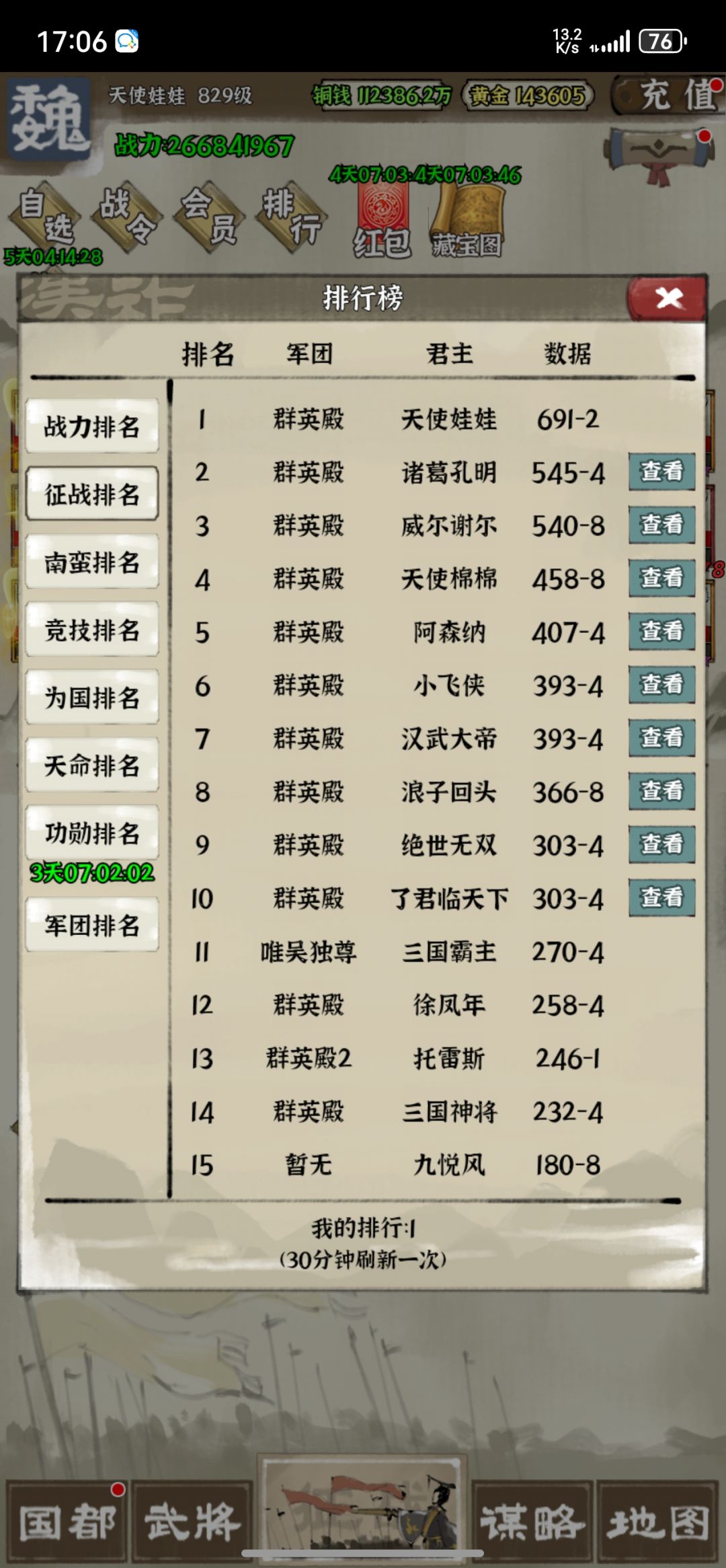 自我介绍:身份:微氪玩家。理念:佛系发展专注PVE。 游戏界面最下面五块内容,分别讲一下 第一部分征战 主要讲一下箱子最好等官职为君主再开,经验和钱啥的官职越高开的越多,除非急用 我作为微氪玩家每天只点一次免费速战,免费铜钱,开永久会员养老 铜钱的使用: 个人原则是该用就用,尽量攒着前期不是很够 黄金的使用: 个人原则是从来不用,攒20万和两千抽参与活动,黄金抽武将加速吕布进度 华容道: 个人玩法