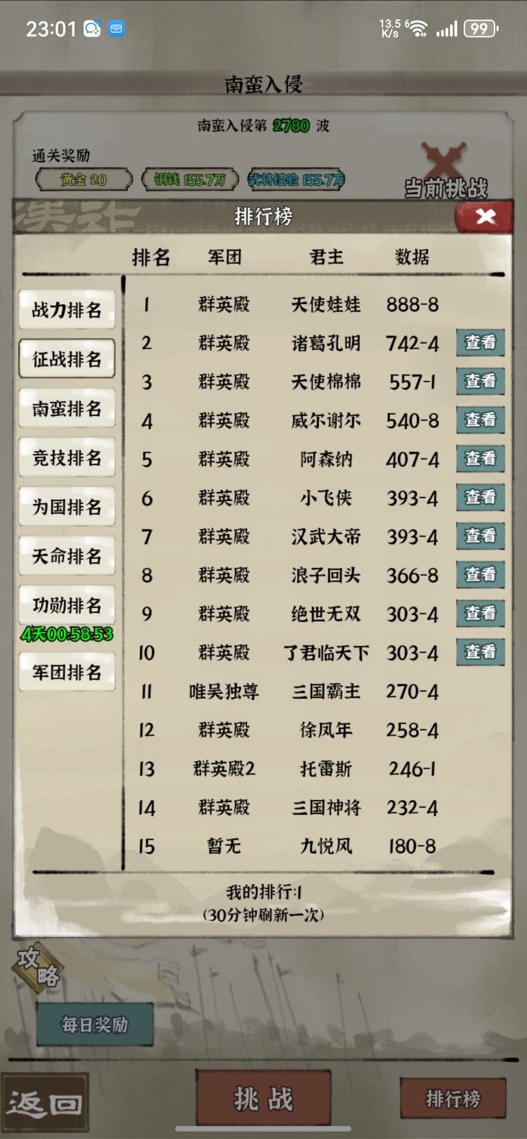 时隔1年5个月,终于完成推图1000关的,阵容还是有很多不足和短板,比如红卡练度太低,很多关卡也都是很极限或者靠着连点器挂机过的,分享一些前人大佬的经验:1、善用凤雏的复活技能,可以相当于单回合孙策单抗一路;2、邓艾和烛龙叠加可以让华佗被动回血变成倒扣血,金邓艾加双烛龙更明显;3、征战四方的装备要早点推,可以越级提升装备,前期阵容借用司马懿的技能可以提高阵容存活空间,标准是可以抗一次攻击,不过差不