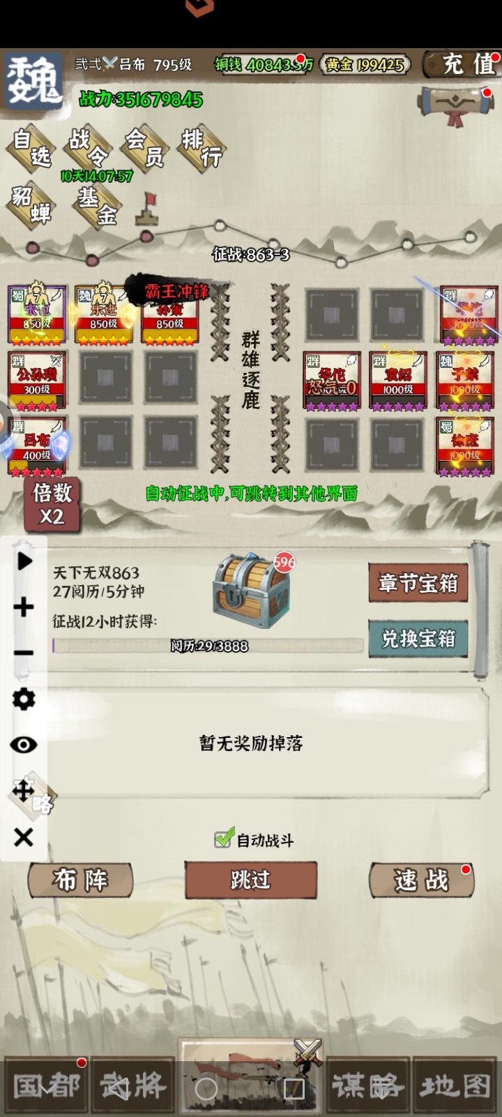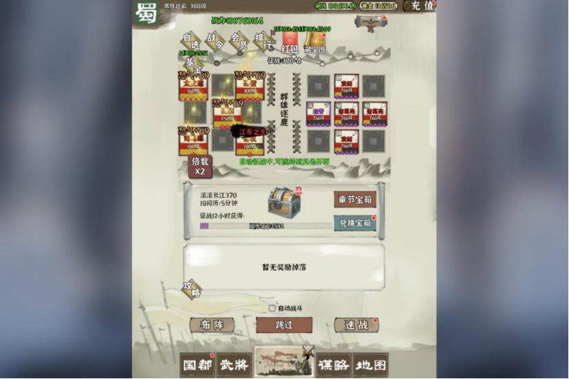 时隔1年5个月,终于完成推图1000关的,阵容还是有很多不足和短板,比如红卡练度太低,很多关卡也都是很极限或者靠着连点器挂机过的,分享一些前人大佬的经验:1、善用凤雏的复活技能,可以相当于单回合孙策单抗一路;2、邓艾和烛龙叠加可以让华佗被动回血变成倒扣血,金邓艾加双烛龙更明显;3、征战四方的装备要早点推,可以越级提升装备,前期阵容借用司马懿的技能可以提高阵容存活空间,标准是可以抗一次攻击,不过差不