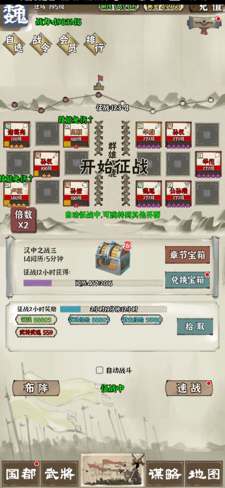 自我介绍:身份:微氪玩家。理念:佛系发展专注PVE。游戏界面最下面五块内容,分别讲一下第一部分征战主要讲一下箱子最好等官职为君主再开,经验和钱啥的官职越高开的越多,除非急用我作为微氪玩家每天只点一次免费速战,免费铜钱,开永久会员养老铜钱的使用:个人原则是该用就用,尽量攒着前期不是很够黄金的使用:个人原则是从来不用,攒20万和两千抽参与活动,黄金抽武将加速吕布进度华容道:个人玩法