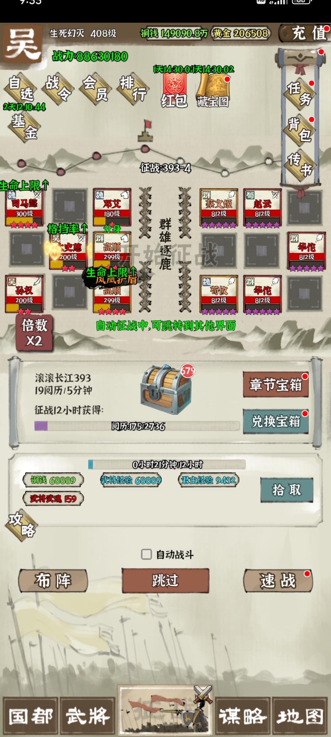 时隔1年5个月,终于完成推图1000关的,阵容还是有很多不足和短板,比如红卡练度太低,很多关卡也都是很极限或者靠着连点器挂机过的,分享一些前人大佬的经验:1、善用凤雏的复活技能,可以相当于单回合孙策单抗一路;2、邓艾和烛龙叠加可以让华佗被动回血变成倒扣血,金邓艾加双烛龙更明显;3、征战四方的装备要早点推,可以越级提升装备,前期阵容借用司马懿的技能可以提高阵容存活空间,标准是可以抗一次攻击,不过差不