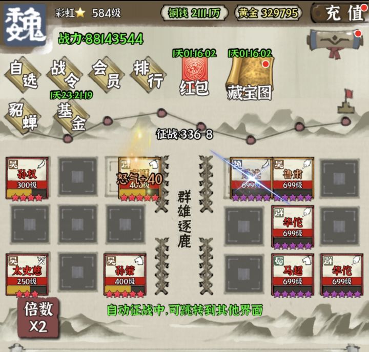 时隔1年5个月,终于完成推图1000关的,阵容还是有很多不足和短板,比如红卡练度太低,很多关卡也都是很极限或者靠着连点器挂机过的,分享一些前人大佬的经验:1、善用凤雏的复活技能,可以相当于单回合孙策单抗一路;2、邓艾和烛龙叠加可以让华佗被动回血变成倒扣血,金邓艾加双烛龙更明显;3、征战四方的装备要早点推,可以越级提升装备,前期阵容借用司马懿的技能可以提高阵容存活空间,标准是可以抗一次攻击,不过差不