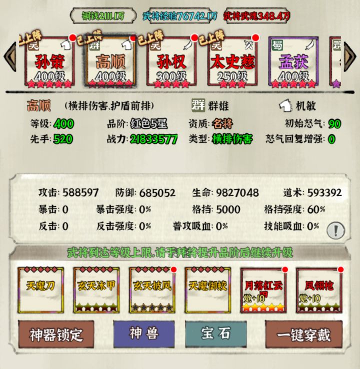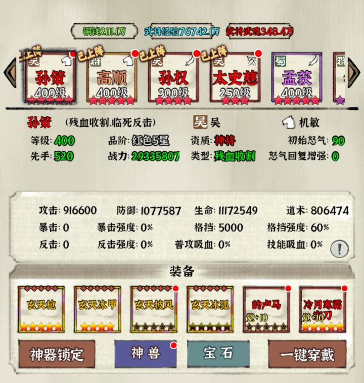 (IOS一服,id:彩虹⭐️,此时战力:8814W)这应该是全游推图最远的格挡阵,各项数据如下:1️⃣ 红5【孙策】:1117W血量,45级【舍身】回复11.4%生命,40级【遗策】护盾免伤27%生命;另有神兽【灵狐】,增加33%格挡率,附带1.92%生命词条;2️⃣ 红5【高顺】:982W血量,40级【舍身】回复10.8%生命,35级【遗策】护盾免伤25.5%生命;3️⃣ 红4【孙权