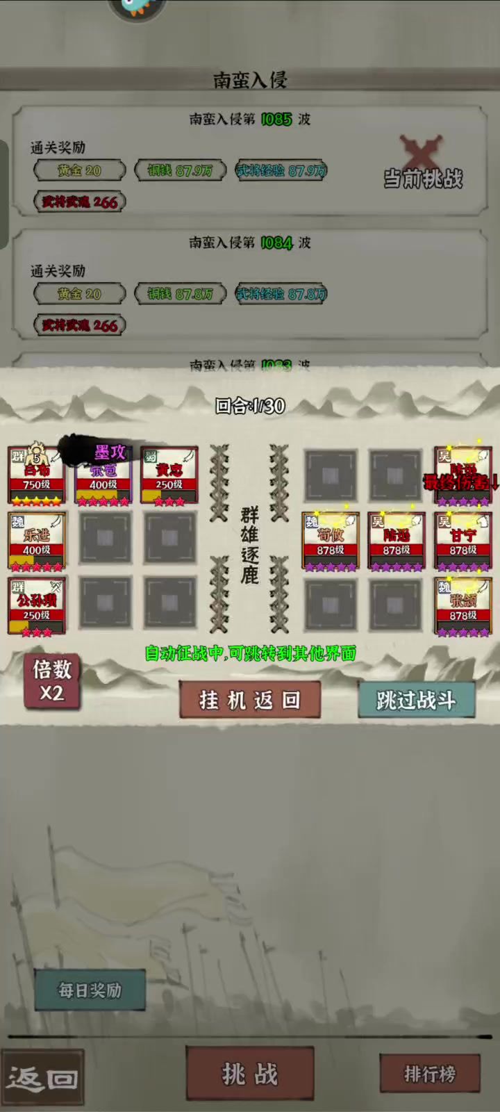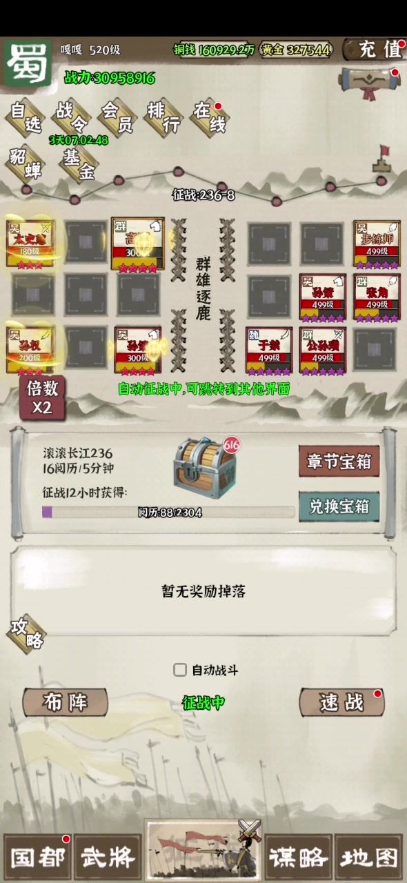 时隔1年5个月,终于完成推图1000关的,阵容还是有很多不足和短板,比如红卡练度太低,很多关卡也都是很极限或者靠着连点器挂机过的,分享一些前人大佬的经验:1、善用凤雏的复活技能,可以相当于单回合孙策单抗一路;2、邓艾和烛龙叠加可以让华佗被动回血变成倒扣血,金邓艾加双烛龙更明显;3、征战四方的装备要早点推,可以越级提升装备,前期阵容借用司马懿的技能可以提高阵容存活空间,标准是可以抗一次攻击,不过差不