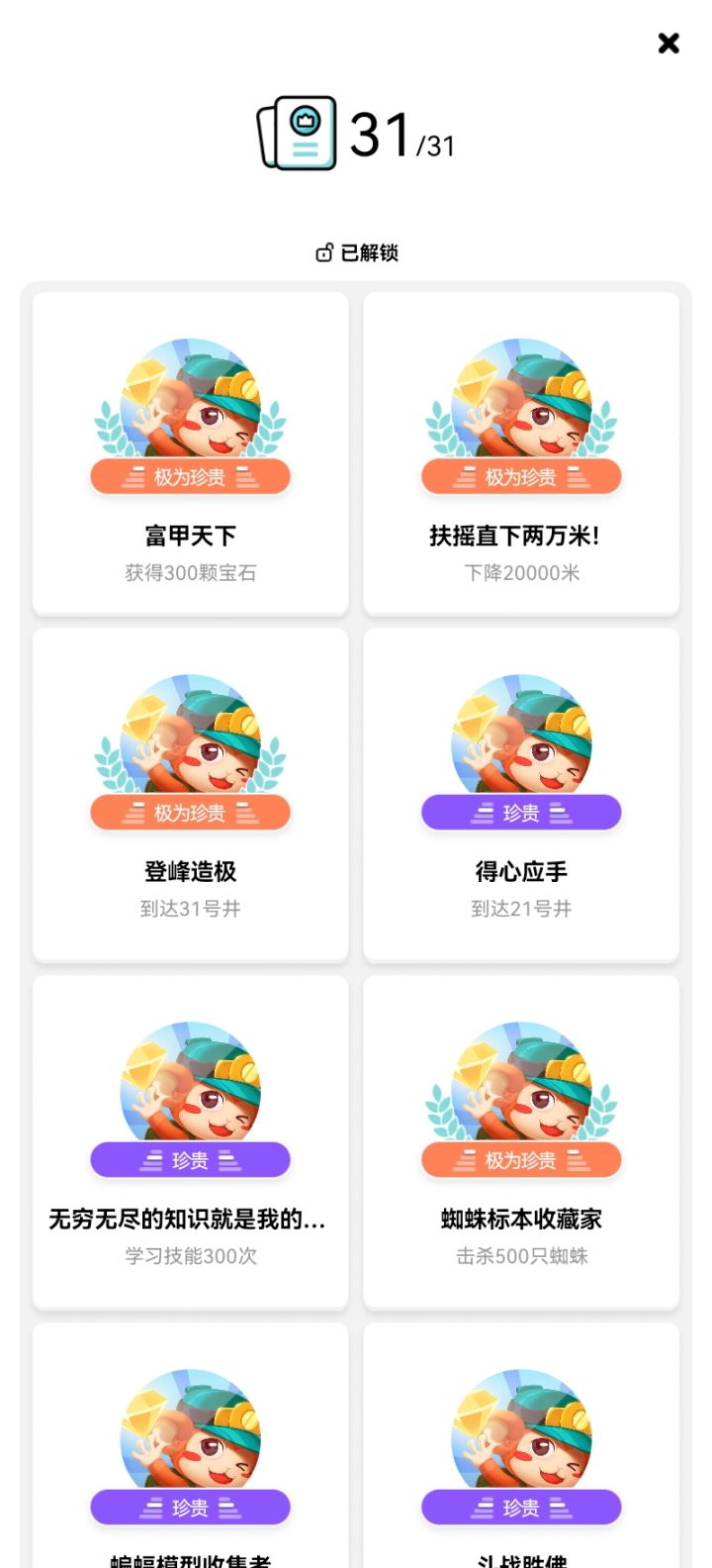 □富甲天下这个成就有问题,不计算左上角签到以及广告获得的宝石,只计算[下矿]获得的,宝石超300之后又刷了N次前5关才达成。