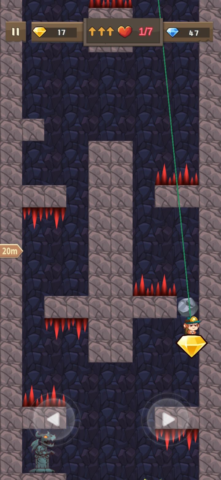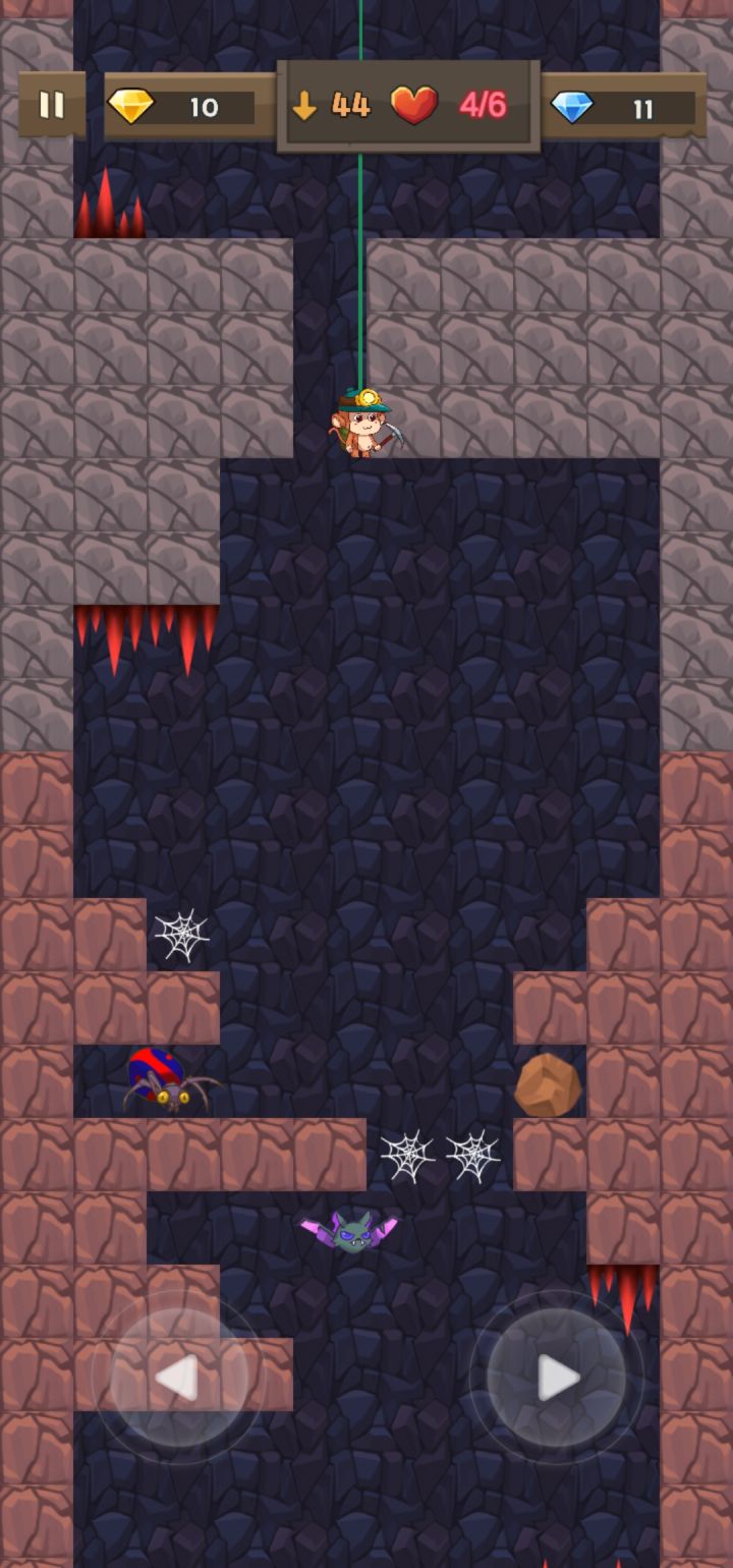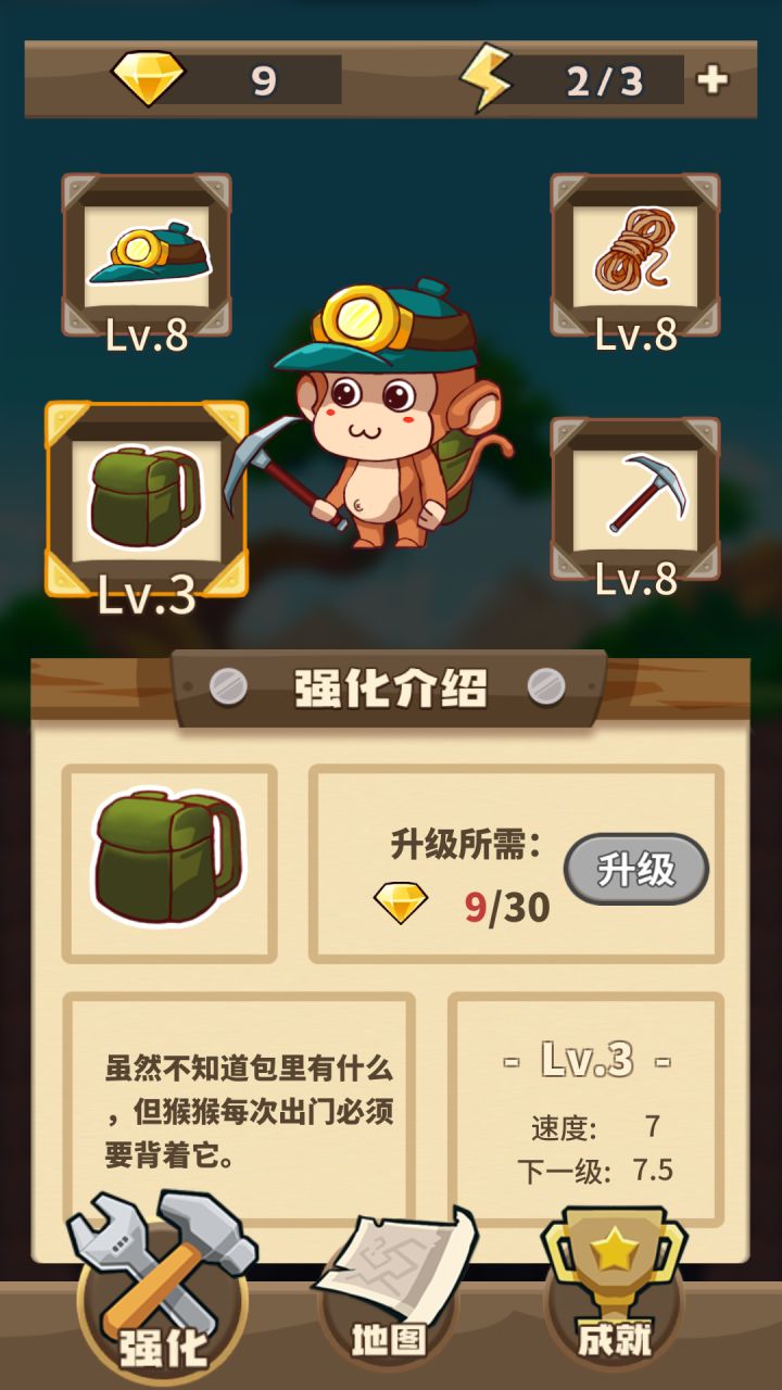 游戏首测,存在很多bug,反馈让官方修。强化界面矿工帽:升的越高越好(满级8级,生命10)镐:升到4级即可(满级8级,攻击8)绳子:有技能,用处不大(满级8级,绳长60)背包:不升,太快了你把握不住地图界面(42层镇帖)因为首测的原因,只开放了丛林丛林攻略一、技能目前共有14种技能(不含2个直接加血)No.1钻石/香蕉相关磁铁(12钻):自动收集钻石/香蕉定期存款(10钻