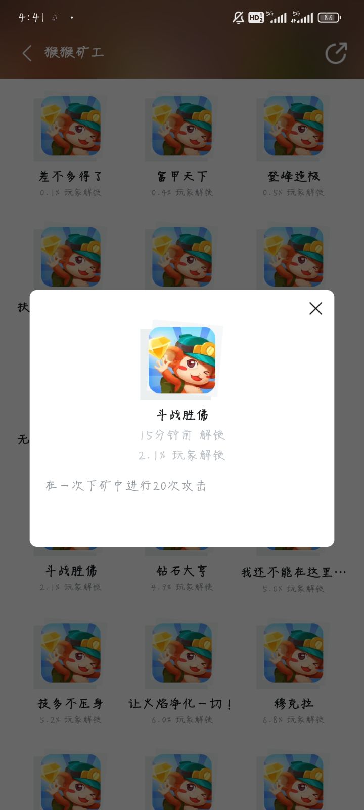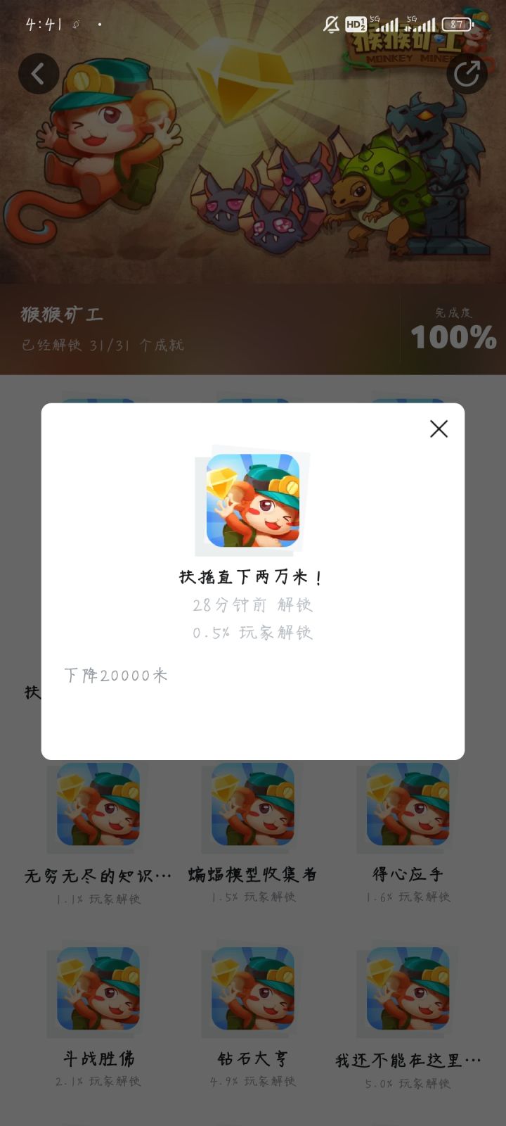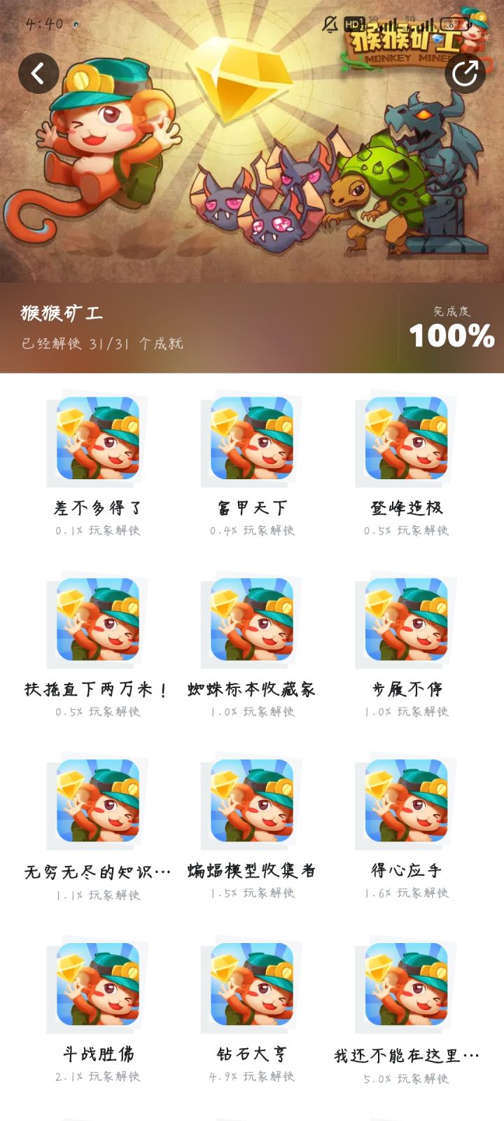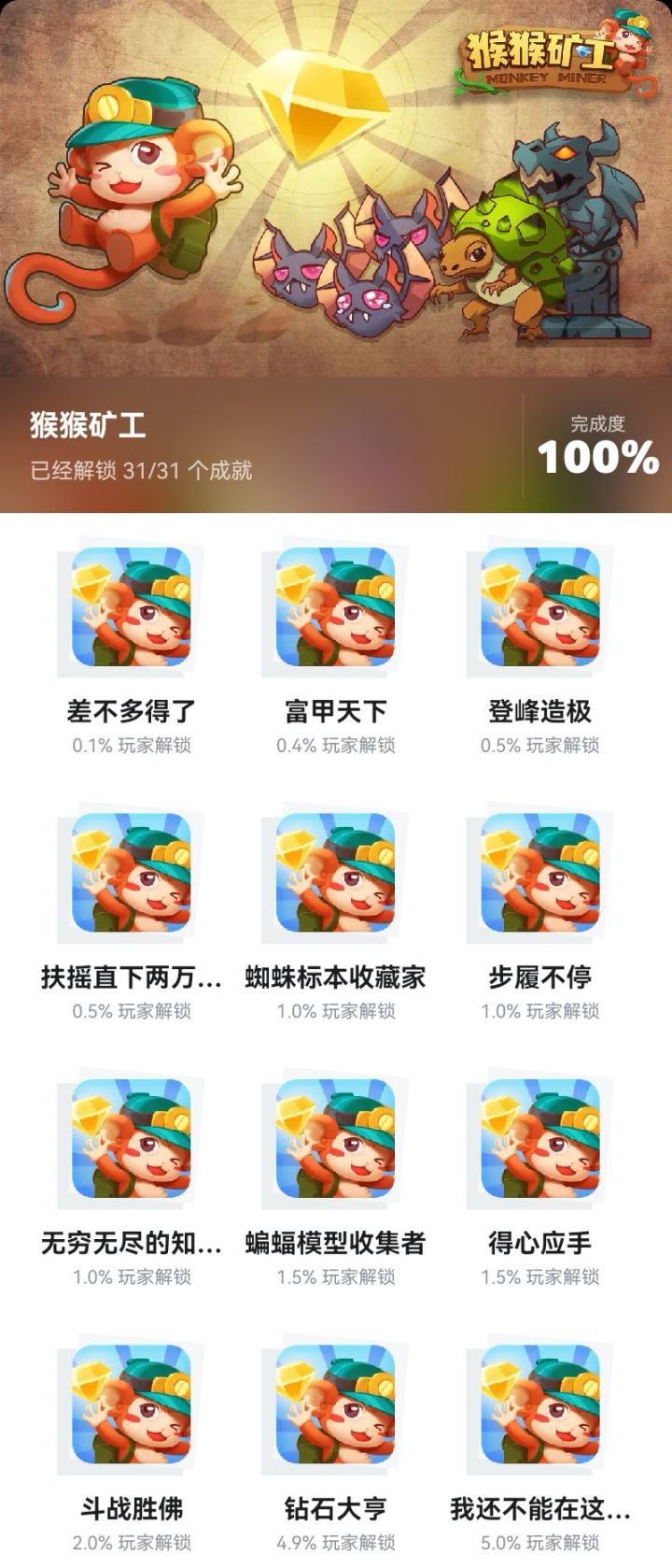 ■成就相关□非常离谱,全部都是隐藏成就。杀怪数量、复活次数、累计下矿米数等需要小肝一下才能拿到。□富甲天下这个成就有问题,不计算左上角签到以及广告获得的宝石,只计算[下矿]获得的,宝石超300之后又刷了N次前5关才达成。■攻略心得□装备内的矿镐[必须]升到4级,不然打后面的怪敲一下跟两下的区别是天堂与地狱。□次要强化绳子,如果运气不好拿到不到加米数的技能,就靠基础数值来过渡,不用升高。□