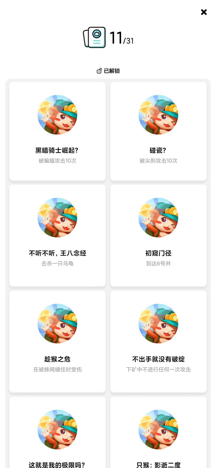 ■成就相关□非常离谱,全部都是隐藏成就。杀怪数量、复活次数、累计下矿米数等需要小肝一下才能拿到。□富甲天下这个成就有问题,不计算左上角签到以及广告获得的宝石,只计算[下矿]获得的,宝石超300之后又刷了N次前5关才达成。■攻略心得□装备内的矿镐[必须]升到4级,不然打后面的怪敲一下跟两下的区别是天堂与地狱。□次要强化绳子,如果运气不好拿到不到加米数的技能,就靠基础数值来过渡,不用升高。□