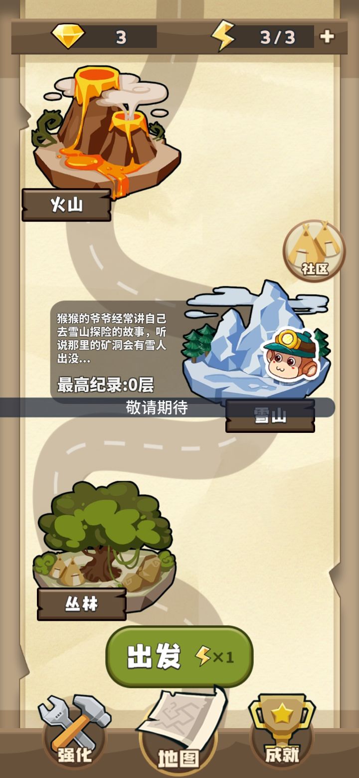 游戏首测,存在很多bug,反馈让官方修。强化界面矿工帽:升的越高越好(满级8级,生命10)镐:升到4级即可(满级8级,攻击8)绳子:有技能,用处不大(满级8级,绳长60)背包:不升,太快了你把握不住地图界面(42层镇帖)因为首测的原因,只开放了丛林丛林攻略一、技能目前共有14种技能(不含2个直接加血)No.1钻石/香蕉相关磁铁(12钻):自动收集钻石/香蕉定期存款(10钻