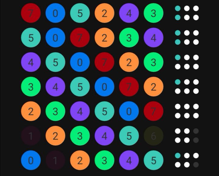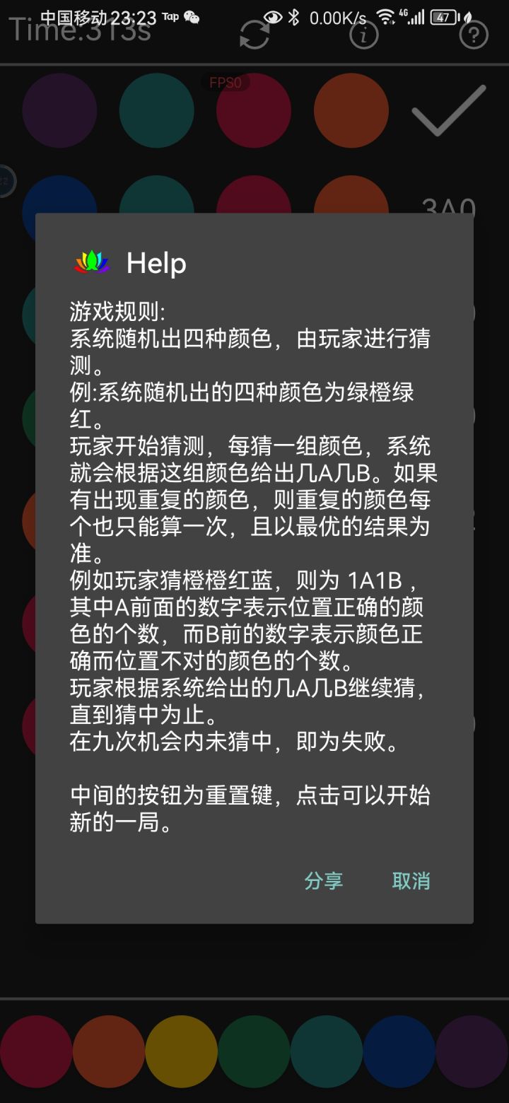 可重复面前你这猜的太折磨人(有大佬证明过这么乱猜下9回合不够用我对颜色没记忆力还得翻译一遍① 1234 1A1B② 3456 0A2B③ 5671 2A0B④ 7123 0A2B⑤ 2345 0A2B⑥ 4567 1A0B⑦ 6712 0A1B───乱猜是真想折磨人呐⑥⑦轮12替换45等价,全半对总数仅1得½已知:12和45各有一,或67中有一;④⑦轮6换3全半对总数-1,必然有3无6;②⑥轮7换3同上,无7;②④⑤轮均为半对,则3在第三格为全对;由无67代入第③轮,51为全对,代入①得24为混淆;代入⑥5还在第二格全对5531青青黄红