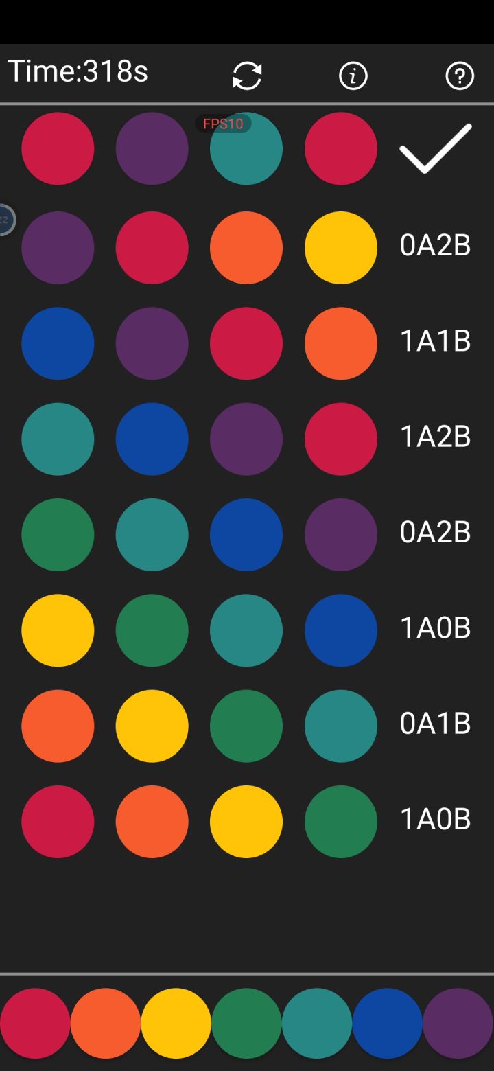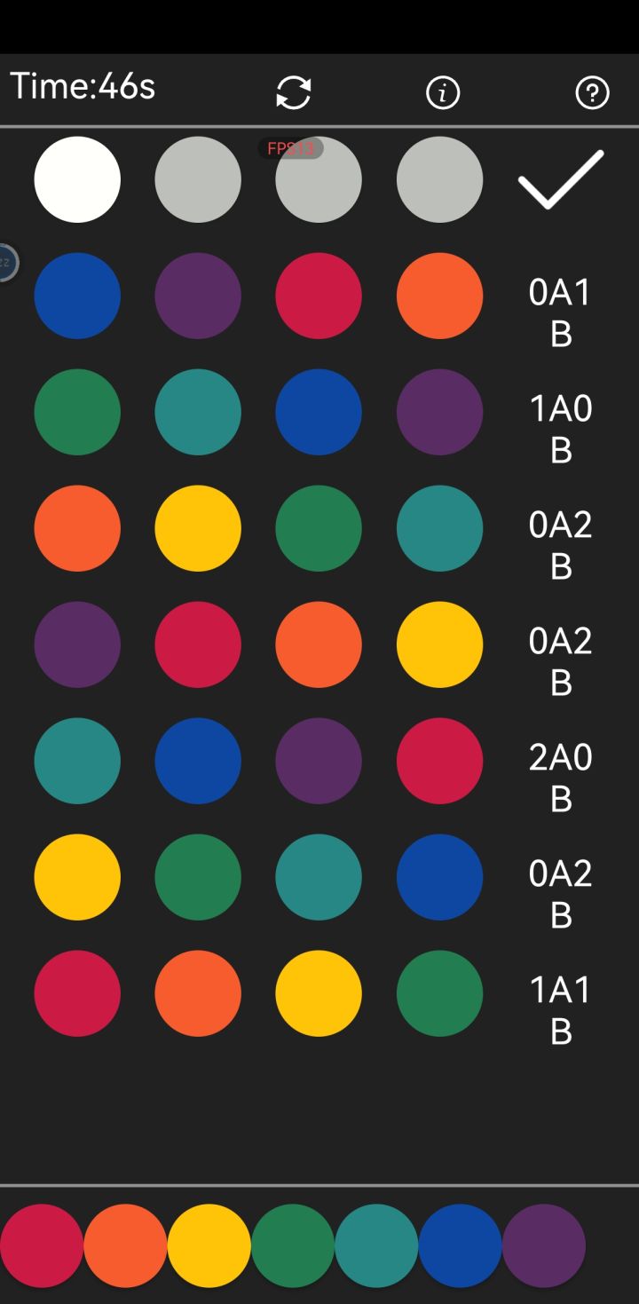 ②③轮只换掉青绿,正好2个全对没了,能确定第三四格是青绿,且没有红橙,蓝紫其中一个是半对,则有蓝在第一格或有紫在第二格;第①轮只剩半对为黄;然后是纯运气猜½黄紫青绿 或楼主的答案只不过有重复却给无重复的题目就太简单了