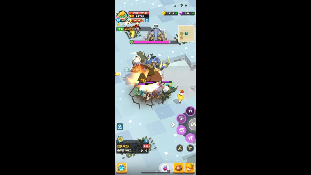 塔防阵容:一个13火球两个9火球,一个18迫击炮一个18弩。弩的作用并不大,主要是三个火球塔打boss,一个迫击炮清小怪。勇者阵容:牛、山雀、熊猫、企鹅,牛和山雀可以用我其他帖子里的组合技,熊猫清小怪控boss,企鹅给防御塔和勇者增伤。 城墙我的推荐是放在地图最右边,这样可以把所有小怪聚到城墙左上角。猛犸会在1:33的时候出现,出来时会进行冲刺,然后紧接着战争践踏,这如果冲到城墙上会造成大范围破坏