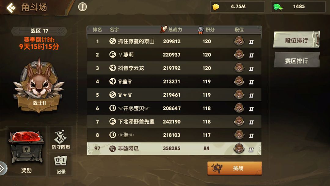 无敌是多么寂寞,如果关卡怪物已经无法满足各位酋长的战斗欲望,那么角斗场一定是不能错过的最佳挑战场所。 【队伍PK 攻守取分】 在角斗场中,玩家可以通过挑战其他玩家获得积分,并且赢取奖励。每位玩家每天可以免费获得3次挑战机会,之后还可以通过完成日常任务获取“角斗场挑战券”增加相应的战斗次数。 每次战斗会在相应赛区随机抽取3位对手供挑战,玩家可以自主选择对手,对手战力越强,获取的积分越高,如果战斗失