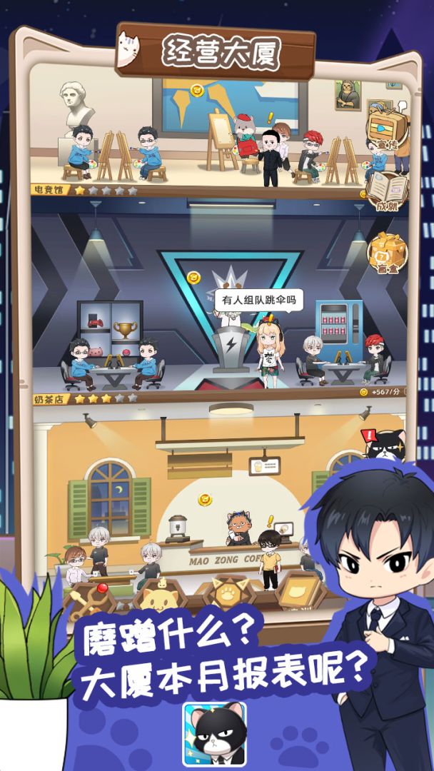 猫总大厦是一款基于妖灵经营的养成类休闲游戏。游戏中玩家可通过安排各种类型的妖灵经营店铺来赚取营业额,然后一步步构建自己的商业大厦。日常营业的过程中,时不时会出现一些形形色色的顾客,与之交谈还会有神秘惊喜。妖灵相关的功能和玩法也同样有趣。大厦的启动资金已准备好,敢不敢来接受挑战,建设属于你心目中的商业大厦!