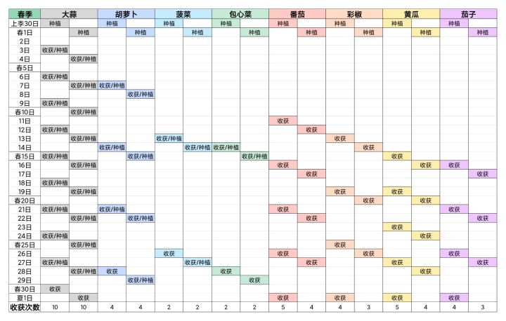 按照每种作物播种收获时间推算,最大收获次数记录,可能存在实际操作误差,仅供参考