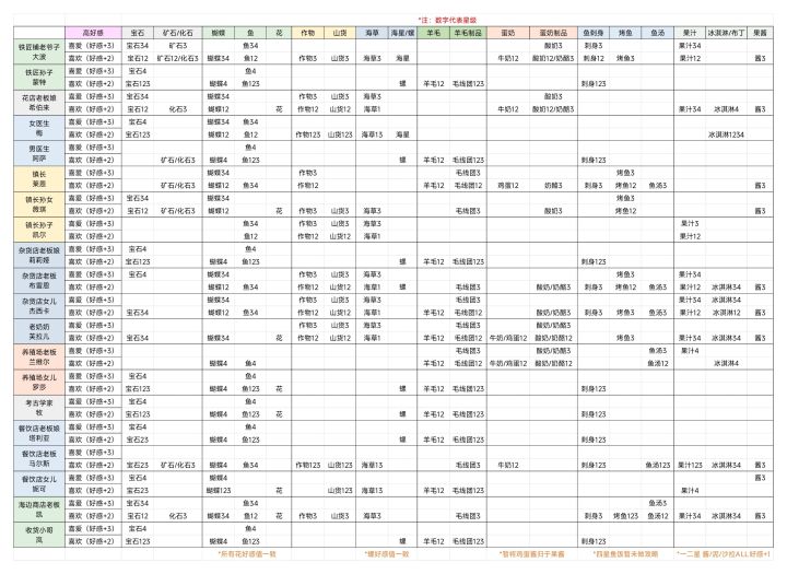此表整理于测试服,可能与正式服有出入。食物制品太多,还有炒菜等食物未整理。部分送礼系统未实装无法整理攻略。#游戏攻略 #牧场气息