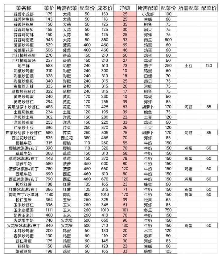 主链接:原贴链接:声明一:搬运自温暖的帖子,图表皆由温暖制作声明二:内容为5测数据,可能有所变动。7测有新增菜谱,并有部分菜谱取消或隐藏。资料更新(2025年10月):动物产品大削