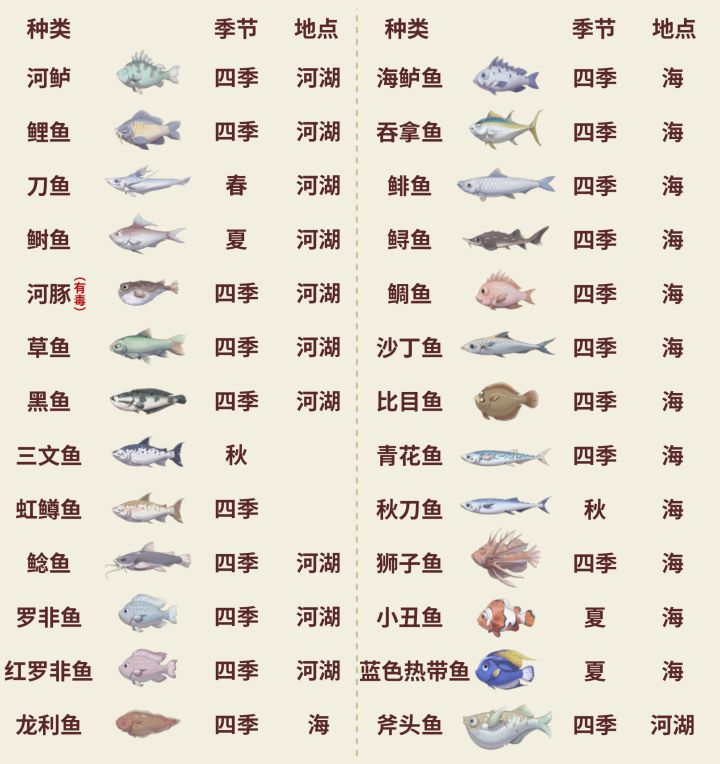 鱼类图鉴 有的鱼没写地点是因为游戏里也没写 应该是所有钓点概率出 欢迎指正 #牧场气息 #攻略