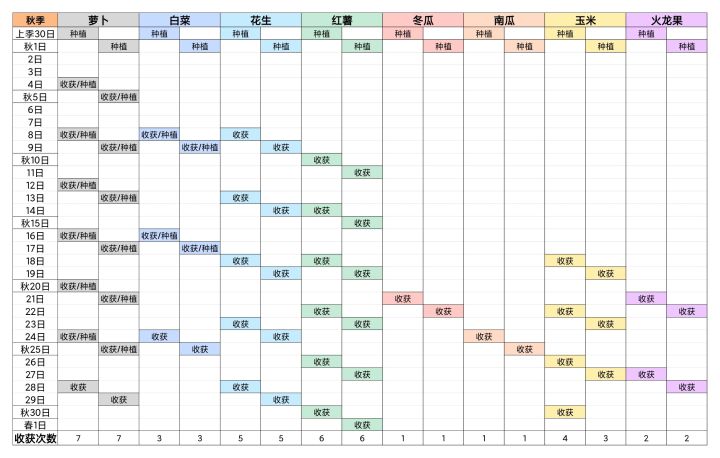 按照每种作物播种收获时间推算,最大收获次数记录,可能存在实际操作误差,仅供参考
