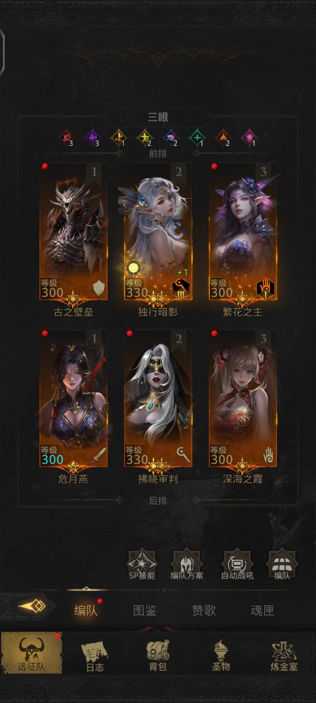 圣子这个boss属实难搞,换了几个人,最终确定人物阵容是极光之舞,暗语使徒,古之壁垒,远航向导(远航挂的链接),永望之歌,深海之霞(详情看图片) 深海带先发魔魂,行动间隔拉到1.7秒以下,只开深海恐惧;远航向导带先发,行动间隔拉低点2.9秒以下,开***,进击之风 暗语只开眩光,无魔盾稳定致盲,龙人(古之壁垒)开烈斩,举盾,烈斩持续释放赌眩晕,叠负面效果80%就行,极光只开减抗的技能 (记得要用恒