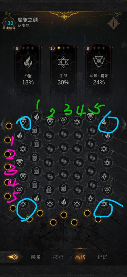 (转载自微社区,原作者:刚才不,ID:9193867) AID:47533 UID:47726 大家好~ 本篇内容介绍一下英雄品格的洗练,以提高英雄的属性,更快的打倒boss! 品格的可用格子会随着灵魂链接等级的增加而逐步解锁,但是洗练的时候也有一点小诀窍: 这是一个没有洗过的幸运英雄,今天就用他来讲一下 1.最先洗练的应该是这四个角落的,这四个固定之后可以永远不再变动,而如果这个位置是错误属性,