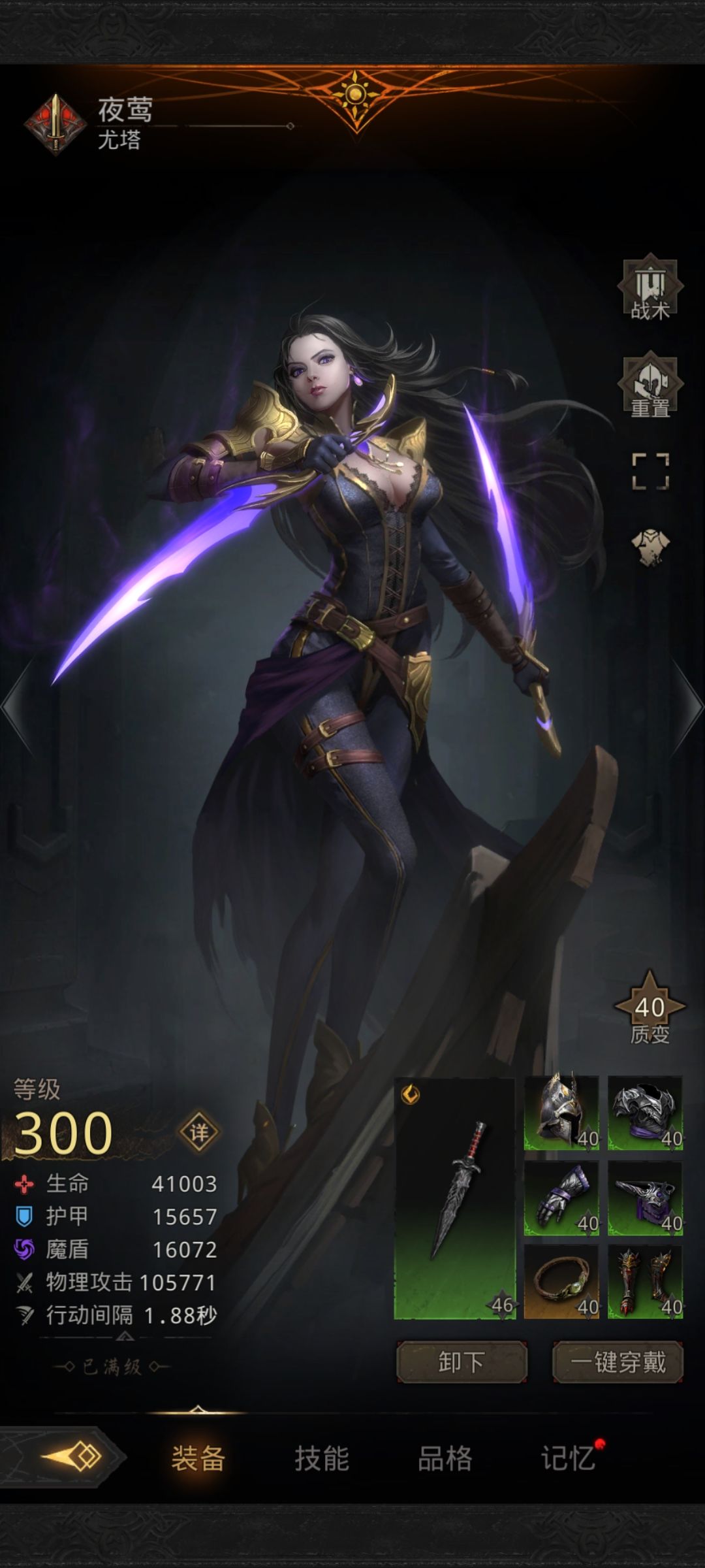 首先,这篇帖子是有一定门槛的,而且这篇帖子是针对已经打到四柱神的玩家,前期的过渡我更推荐大家使用千面,看过我之前的帖子的小伙伴都知道我推荐的原因!那么有请我们这篇帖子的主角 :夜莺 —尤塔 装备组成如下,灵魂链接是210,这是无法球加成的面板 三期的炼成可以去换一把伪装者匕首!这一把匕首是夜莺伤害的核心!而且伪装者匕首做为阵容的门槛也很容易得,仅需16蓝图,符文选择狂热,这是微氪玩家都可以做得到的