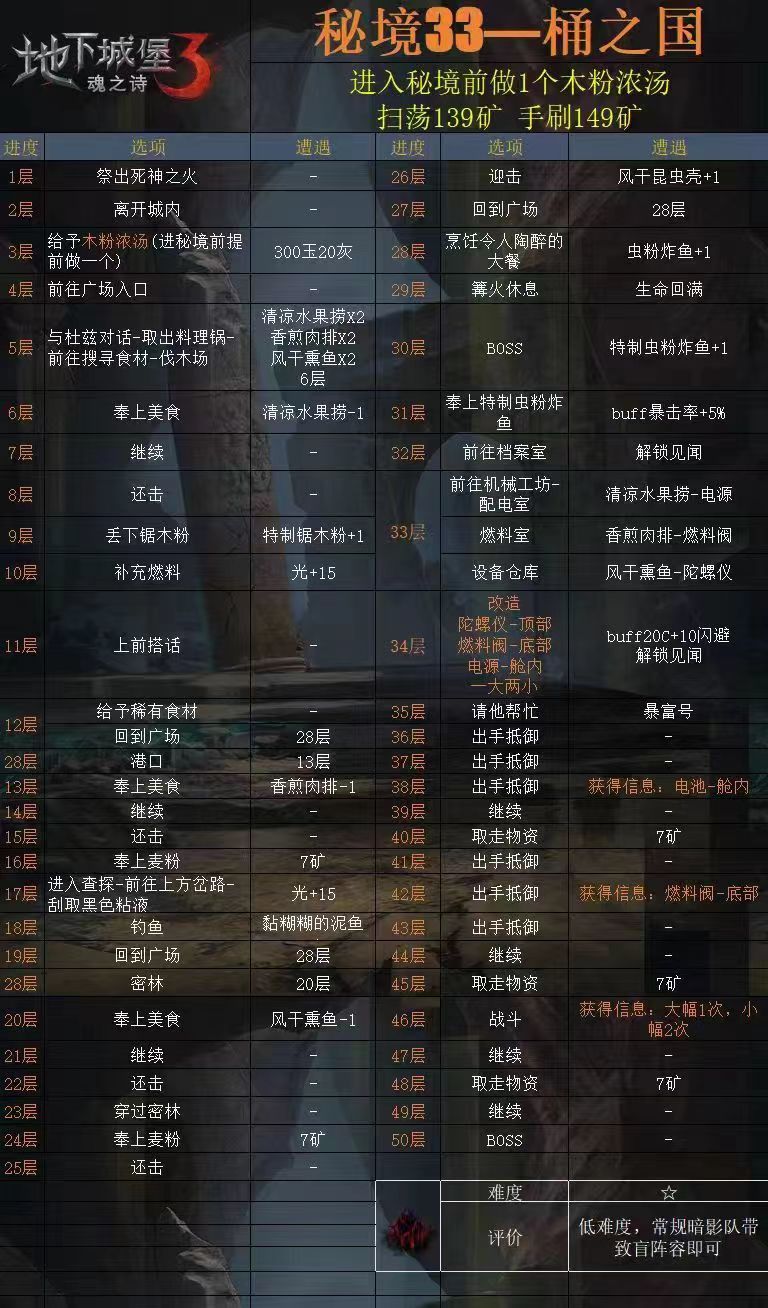 秘境33,常规暗队随便打,没啥难度,流程是抄的群里大佬的,在此感谢。打前记得换木粉浓汤,打完记得换碎片。 稍后上传30和50层视频。 PS:30层BOSS伤害真的高,一秒钟打我娜娜35.1+54.7=89.8给秒了,还好有复活。