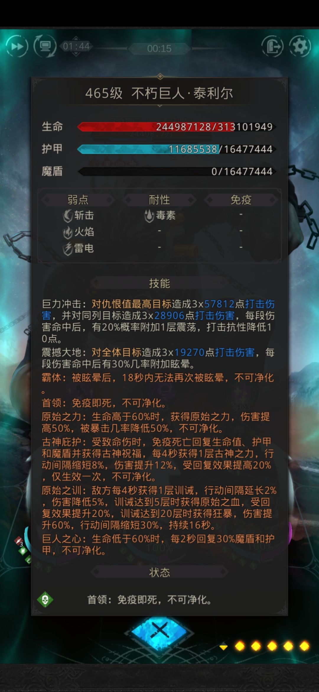 这个50层boss打了三天换了几次武器,换了一次人物,总结一下这个boss的4个难点 前三个难点主要是说明20秒之后己方生存会受到威胁和考验,最后一个难点其实是最大的,尤其是对于面板不高的刮痧流来说,好不容易快打死了,护甲回满,看着残血却打不死,当然我还试过带迅击符文来赌脸,只是时间拖下去也会暴毙,之前看贴子说是用毒,关键就是boss的石化被动能净化之前的抑制回血效果,为此还特意换了一把新出的减疗