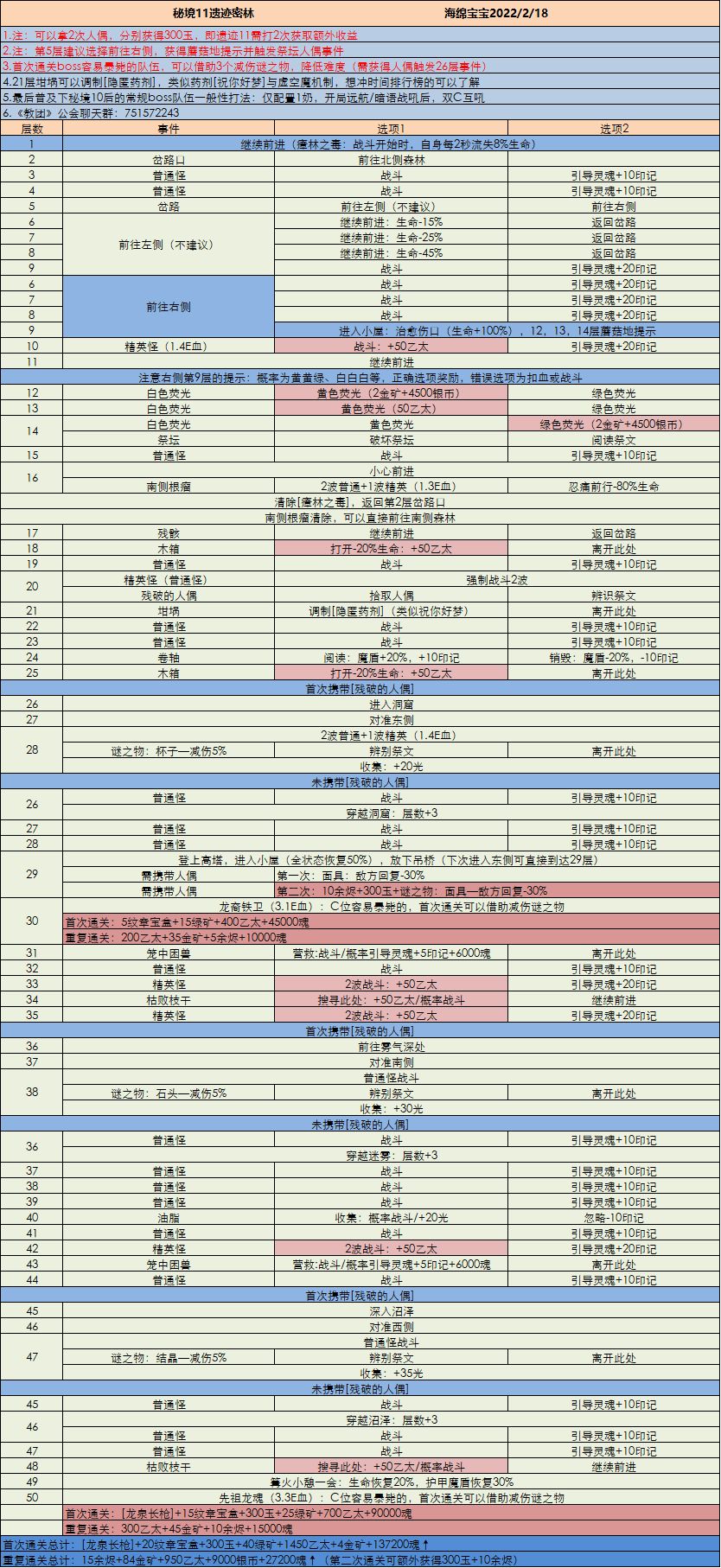 本文由wiki团成员_海绵宝宝_提供,未经作者允许,请勿擅自修改,转载请注明作者并附带本页链接 总结: 1.刷两次后,种菜肝党继续刷秘境9与番外孚日广场吧; 2.人偶问题,注意好在第5层时选择前往右侧,否则14层20层可能无法出现祭坛与人偶,并且后续的26层等祭坛也无法触发。 3.注意点基本写在前言了,欢迎讨论=。= 4.祝招魂师们好运~