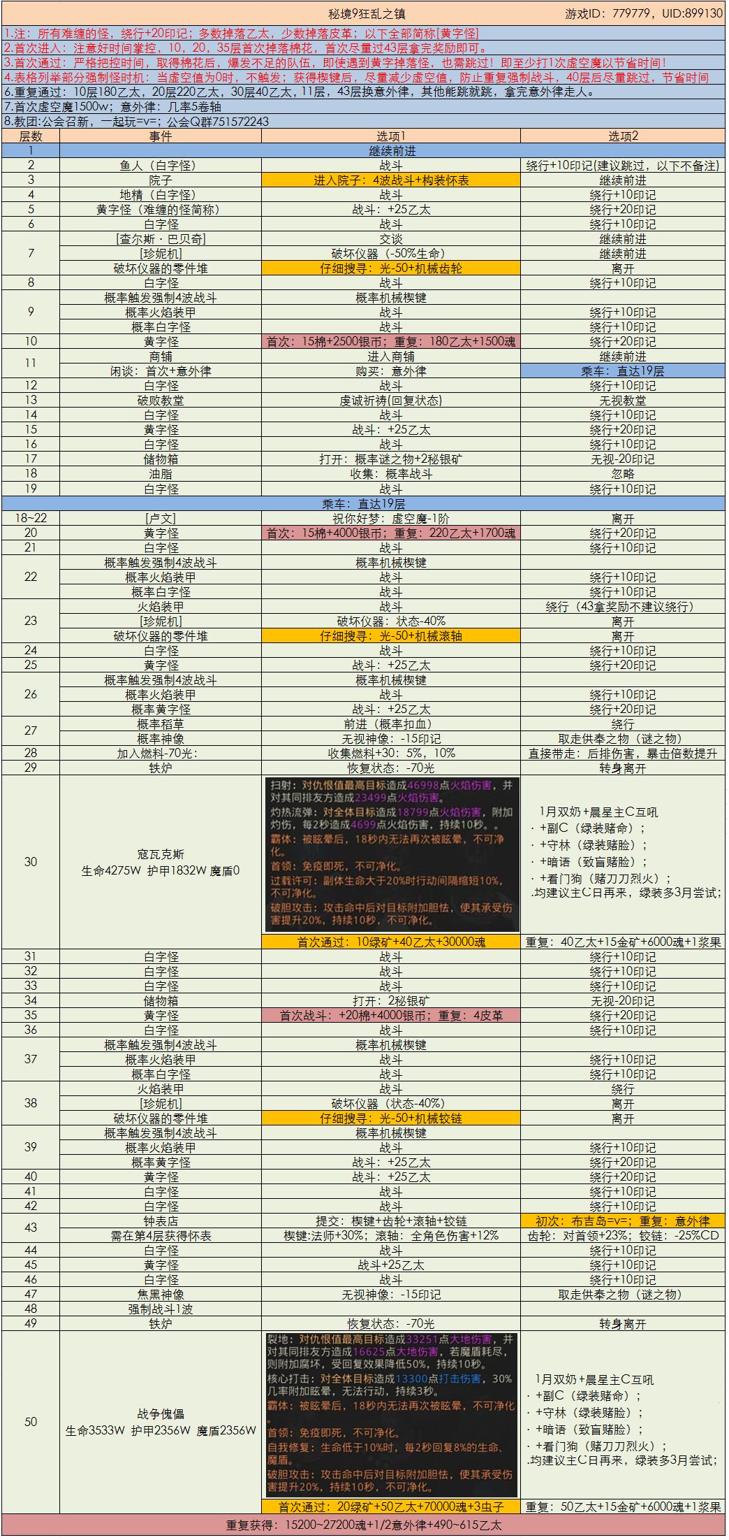 AID:779779 UID:899130 ;游戏昵称:终末之城~~ 公会群Q欢迎聊天小伙伴(751572243) 许多过了秘境8的小伙伴相信配置都足够强力了,秘境9差的也就是时间安排啦,下面给大家奉上秘境9图层详解,大家合理规划时间哦,注意看表格内上方的提示。 额外提示:11层的商铺首次要多次闲谈,可以获得1个意外律。 额外提示:重复虚空魔几率翻车,大佬们请注意(毕竟10层和狂暴一样)