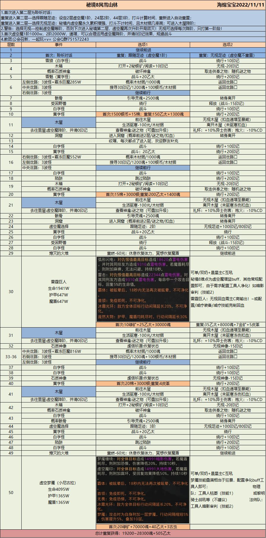 本文由wiki团成员_海绵宝宝_提供,未经作者允许,请勿擅自修改,转载请注明作者并附带本页链接 秘境8流程注意点:跟随足迹和无视足迹的选择—— 简单点说,跟随足迹:2层,24层,44层固定虚空魔等阶; 无视足迹:和之前闯关的秘境一样性质,虚空魔不停的增强,但是可以通过小木屋耗费阳光或者木材降阶(类似其他图祝你好梦); 然后就是虚空魔的技能:梦魇——每层叠加5%伤害和减少5%CD,10层之后和狂暴类
